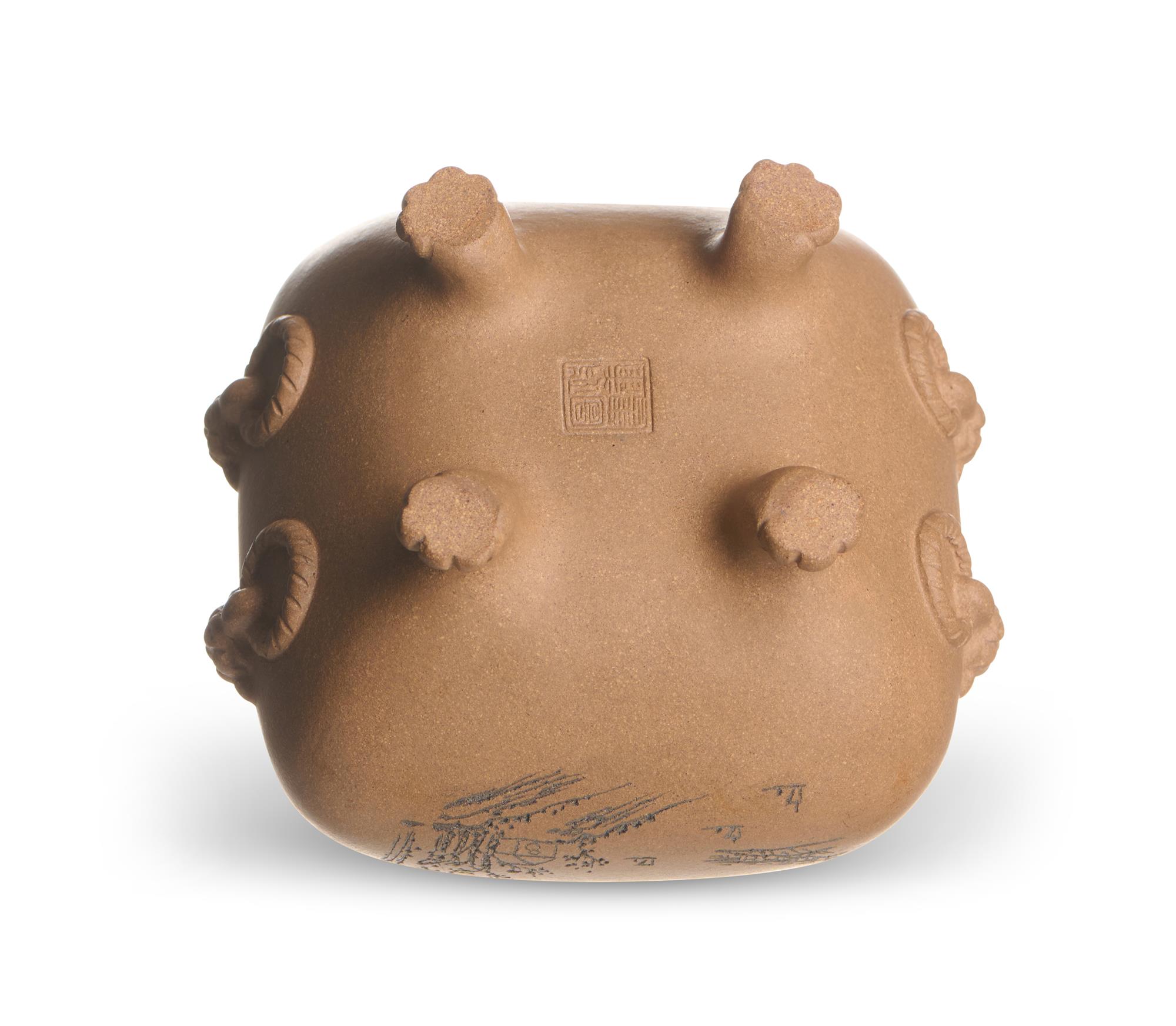 Of archaistic form in yellow clay, with incisde decoration of landscape and ancient coins signed by Ren Yin Ting (1889-1968), and a four character seal mark to the base.