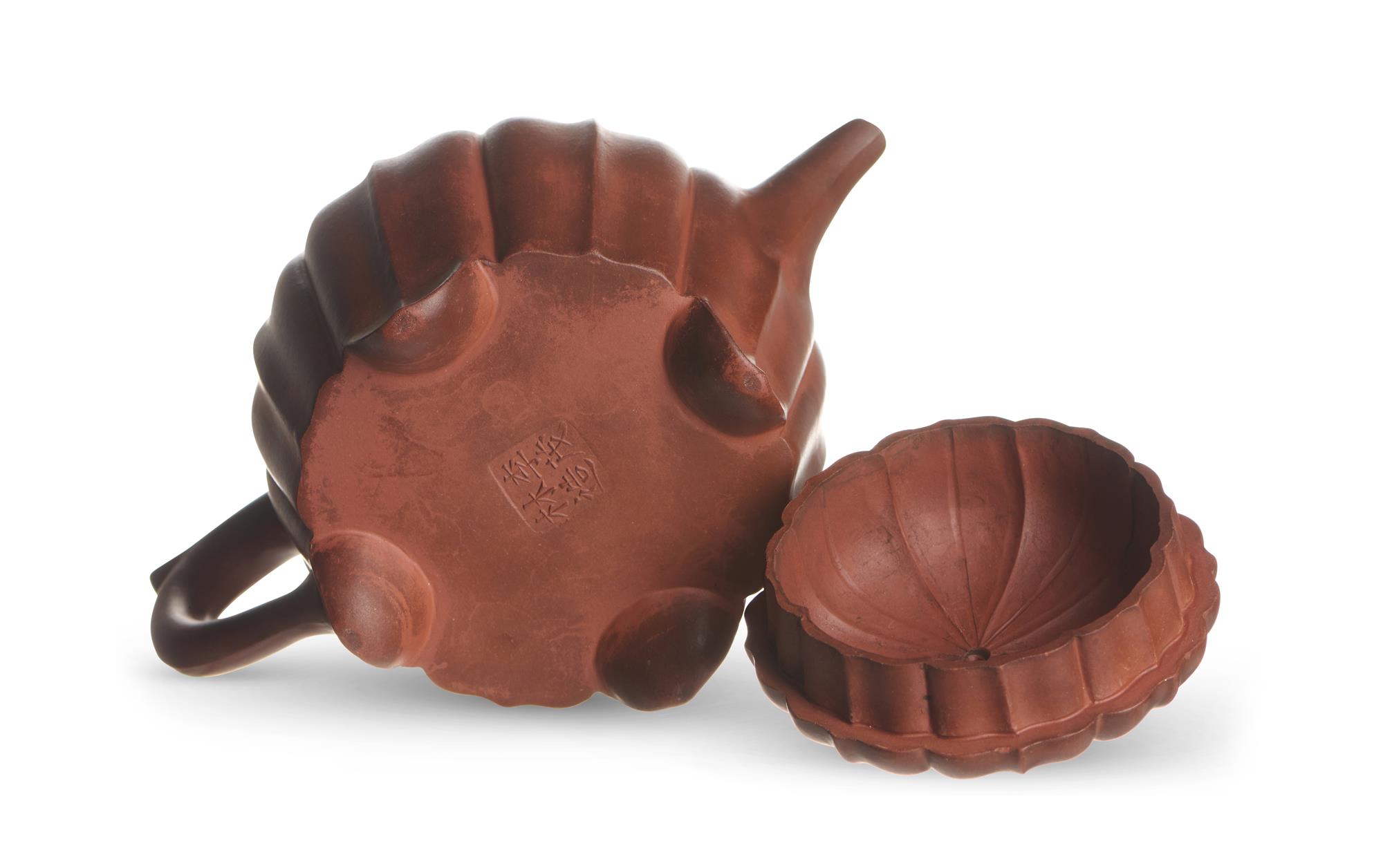 Dramatically modelled as a chrysanthemum blossom in high relief. Four-character mark to base reading 'made by Li Maolin'.