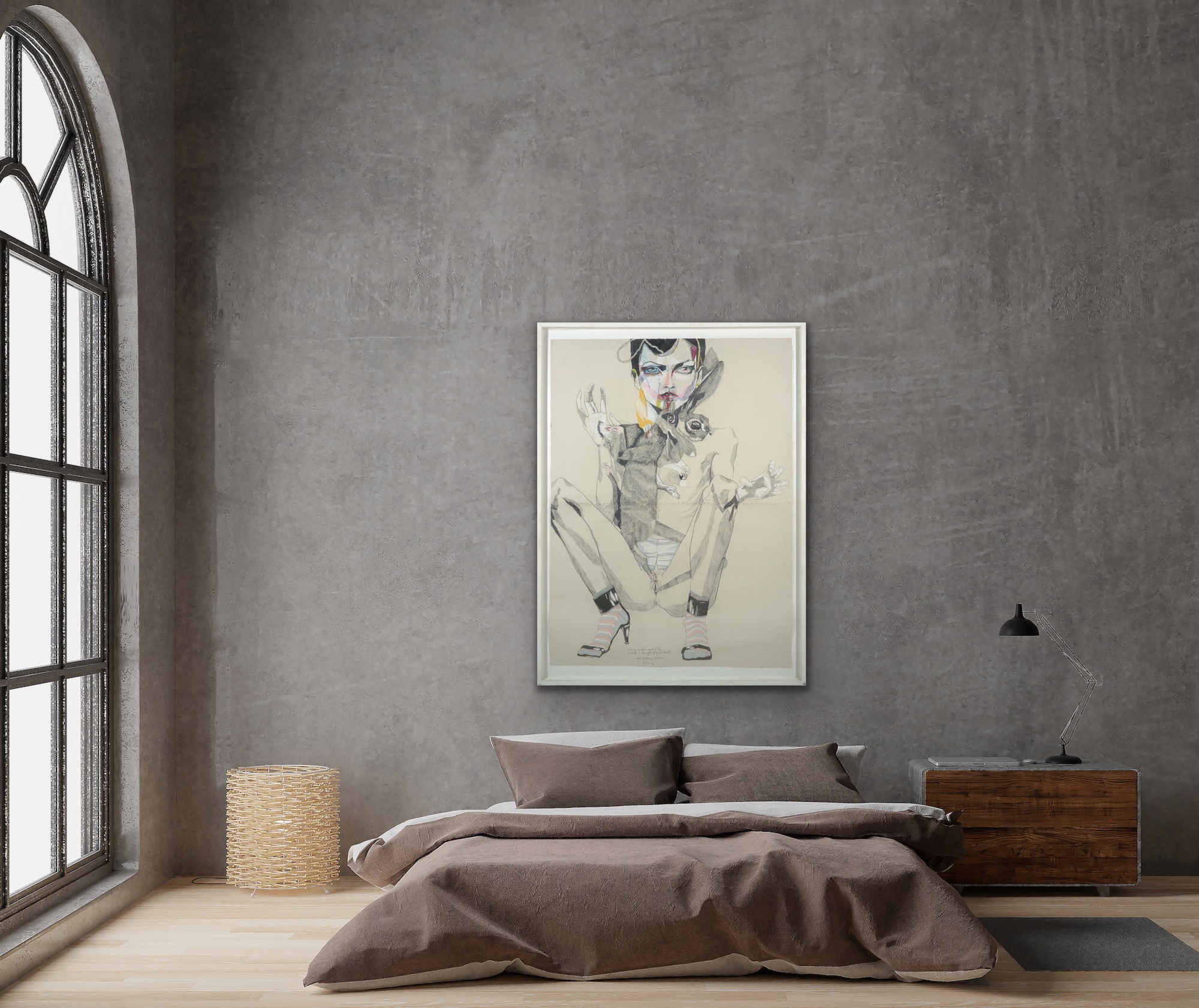 In good condition overall. Inherent holes to the far corners of the work. Natural waves to the paper. Brown paper visible far right edge, appears to be coming from behind. Overall framed size 167 x 123cm.