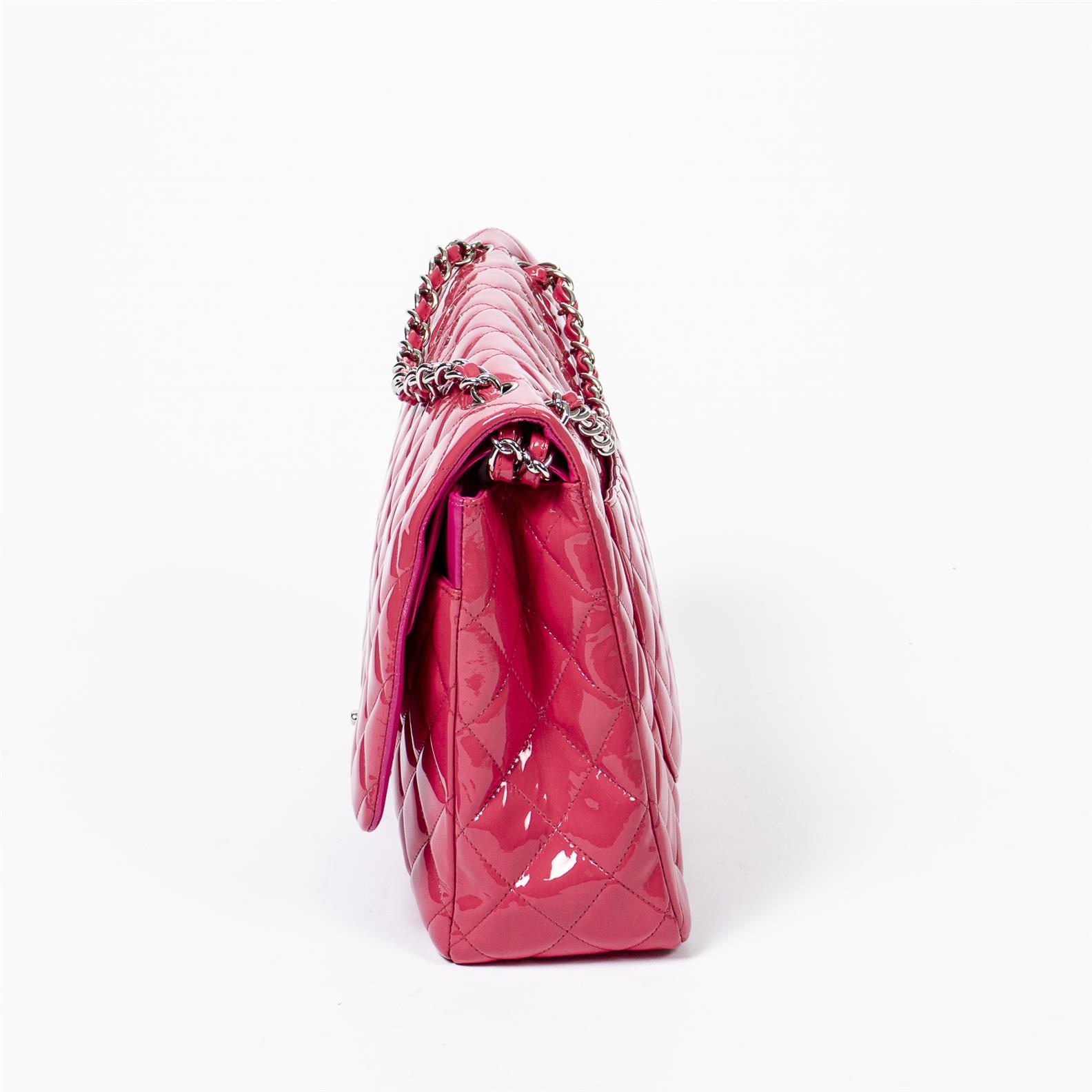 Styled in pink quilted paten leather with interlaced chain strap and silver tone metal hardware, 34 x 23 x 10cm.