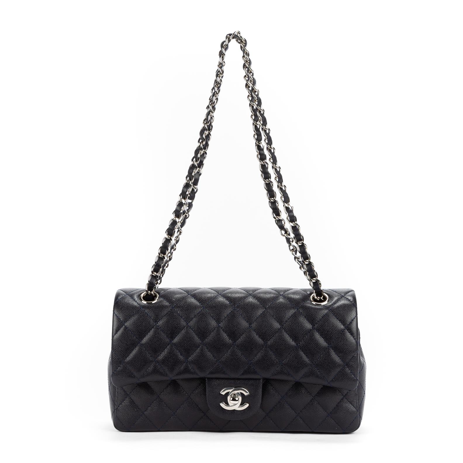 Styled in black quilted Caviar leather with interlaced chain strap and silver tone hardware, 25.5 x 16 x 6 cm.