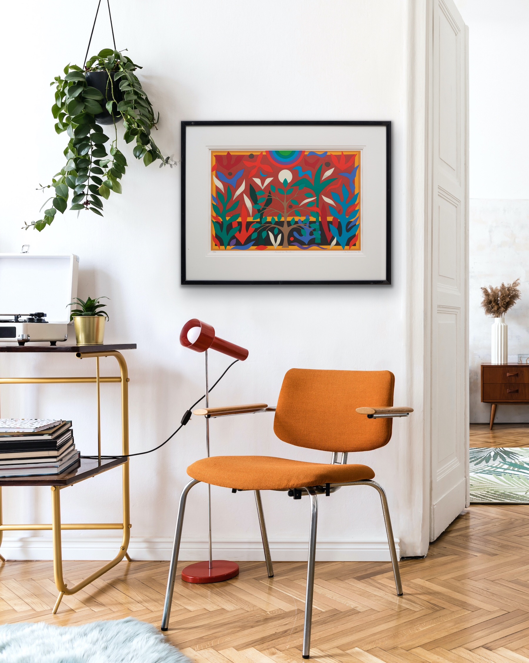 Work is in good condition. There is a slight wave the the right hand edge, indicating that the artwork is not glued down. Overall frame measuring 79 x 101cm.