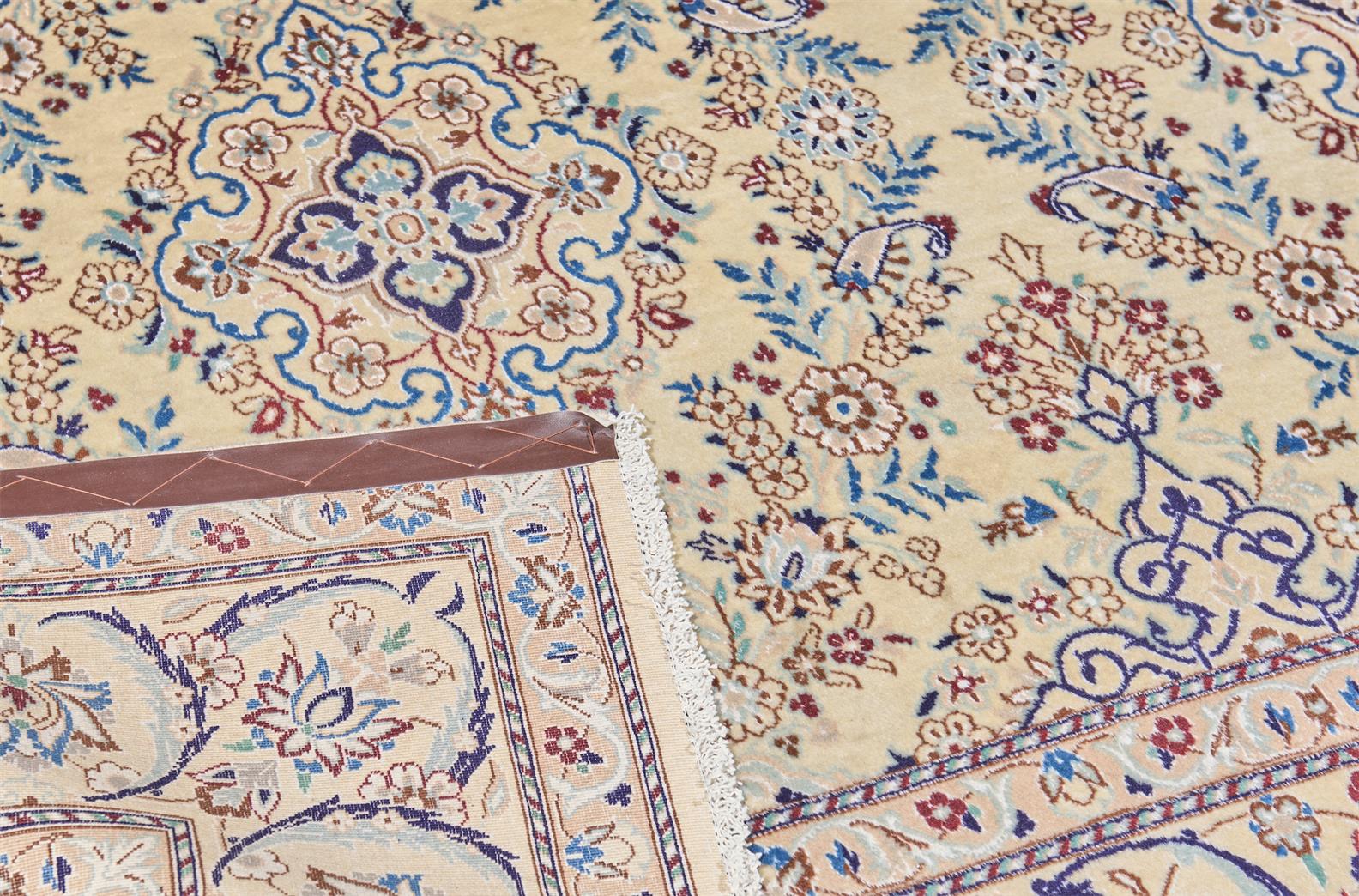 A PERSIAN NAIEN CARPET. SILK & WOOL PILE. FINE WEAVE, CLASSIC NAIEN DESIGN OF DIAMOND SHAPED MEDALLION AND QUARTERED CORNER MEDALLIONS IN A CREAM FIELD. IN SUBURB CONDITION.CERTIFICATE OF AUTHENTICITY INCLUDED. SIZE: 302X210CM ORIGIN: PERSIA - RRP: $8,500 CERTIFICATE OF AUTHENTICITY INCLUDED.