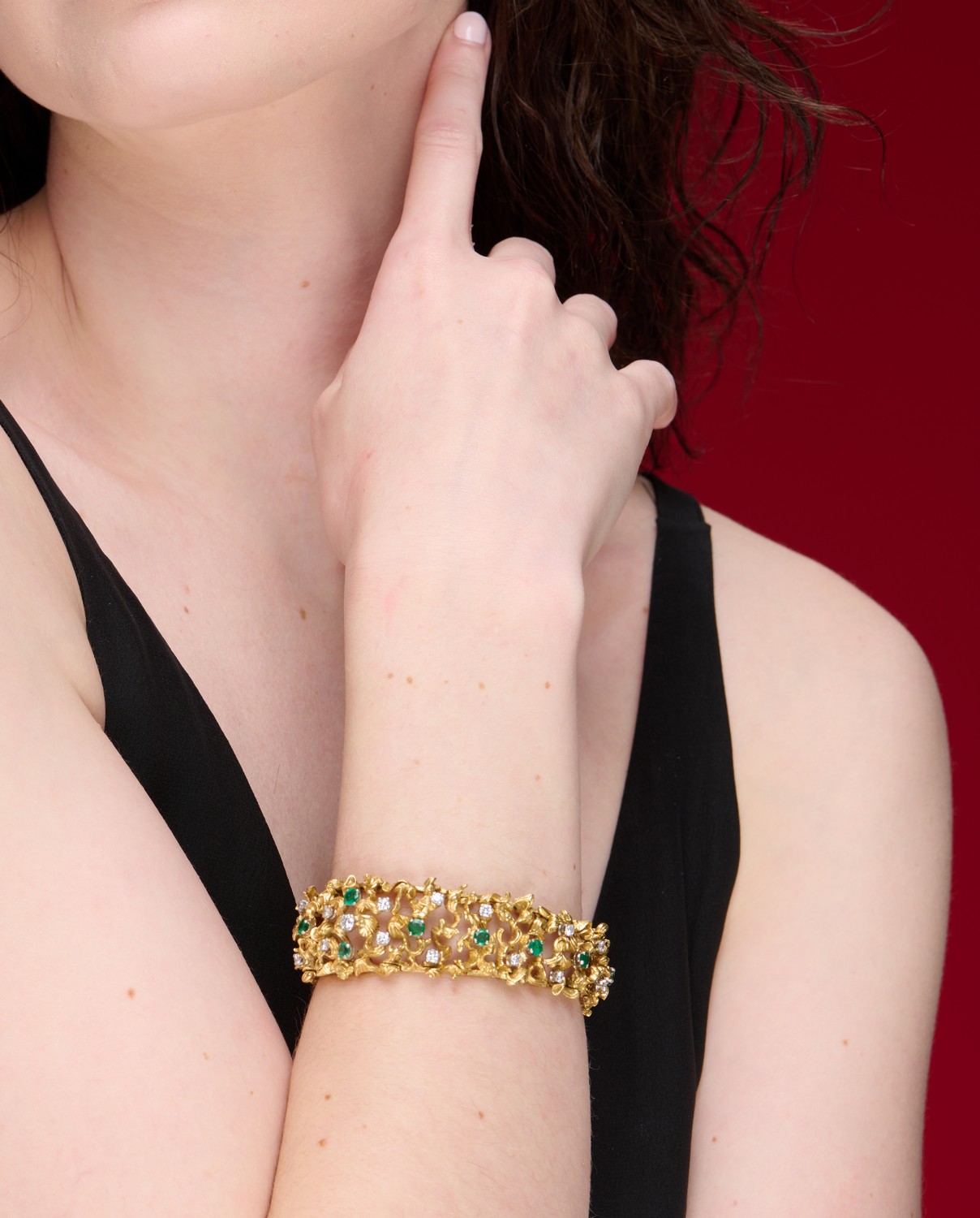 The slightly tapered strap designed as an articulated series of abstract textured links, accented by circular-cut emeralds together weighing approximately 1.80 carats and round brilliant-cut diamonds together weighing approximately 1.54 carats length 190mm.