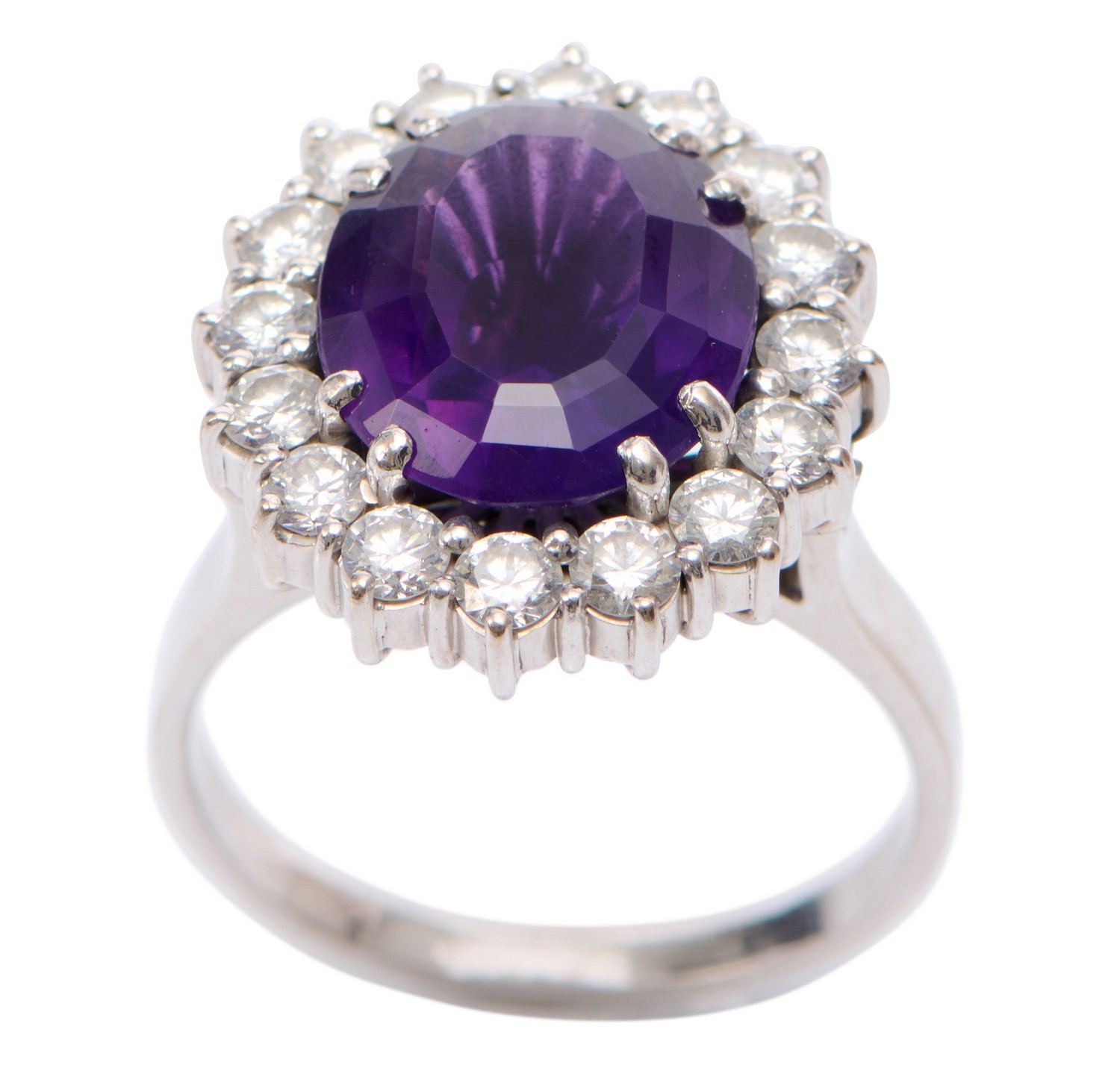 Centring an oval-cut amethyst weighing approximately 4.75 carats, within a surround of round brilliant-cut diamonds together weighing approximately 1.00 carats, ring size P.