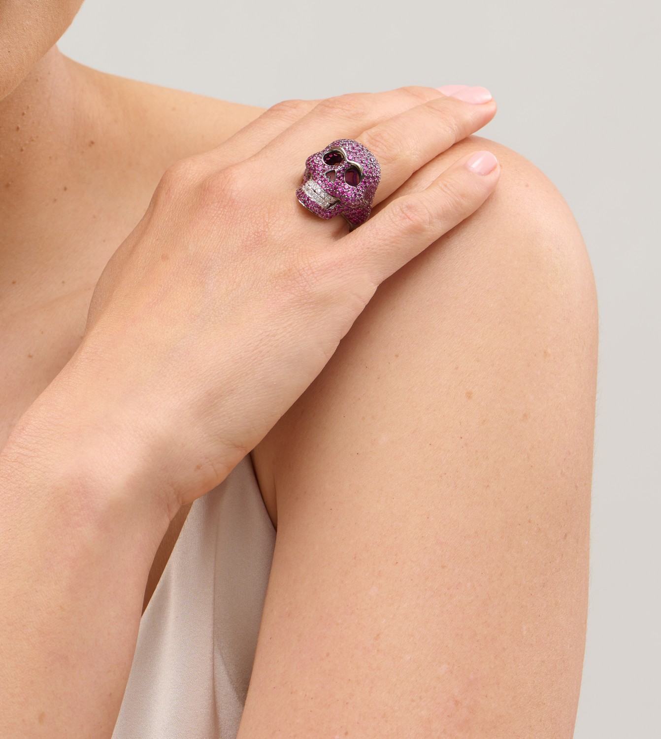 Realistically modelled as a skull, pavé-set with circular-cut pink sapphires between teeth bead-set with brilliant-cut diamonds weighing approximately 0.14 carats, mounted in blackened 18ct gold, size N, signed Lydia Courteille.