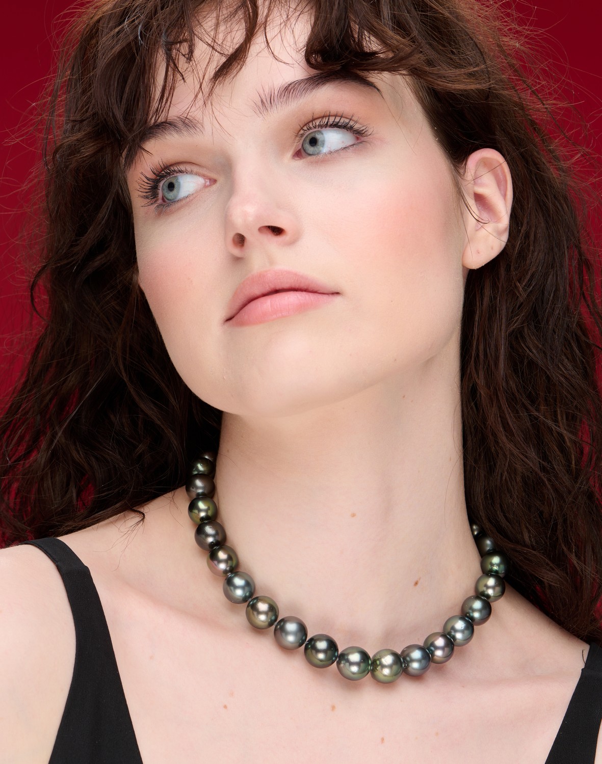 Composed of twenty-nine graduating round pearls of green and grey hues measuring 12.10mm-15mm, completed by a two-tone 18ct gold ball clasp, length 410mm.
