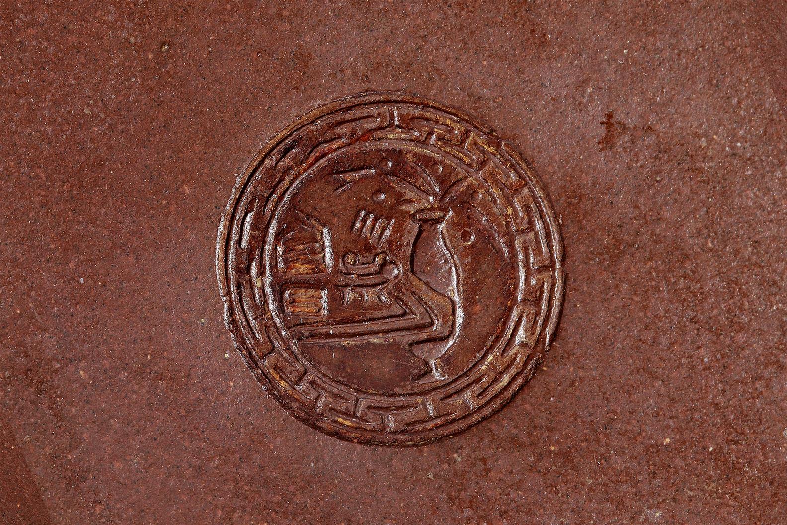 Of archaic bell form in deep purplish-brown clay, with incised calligraphy and landscape decoration to each side, marked to the base.