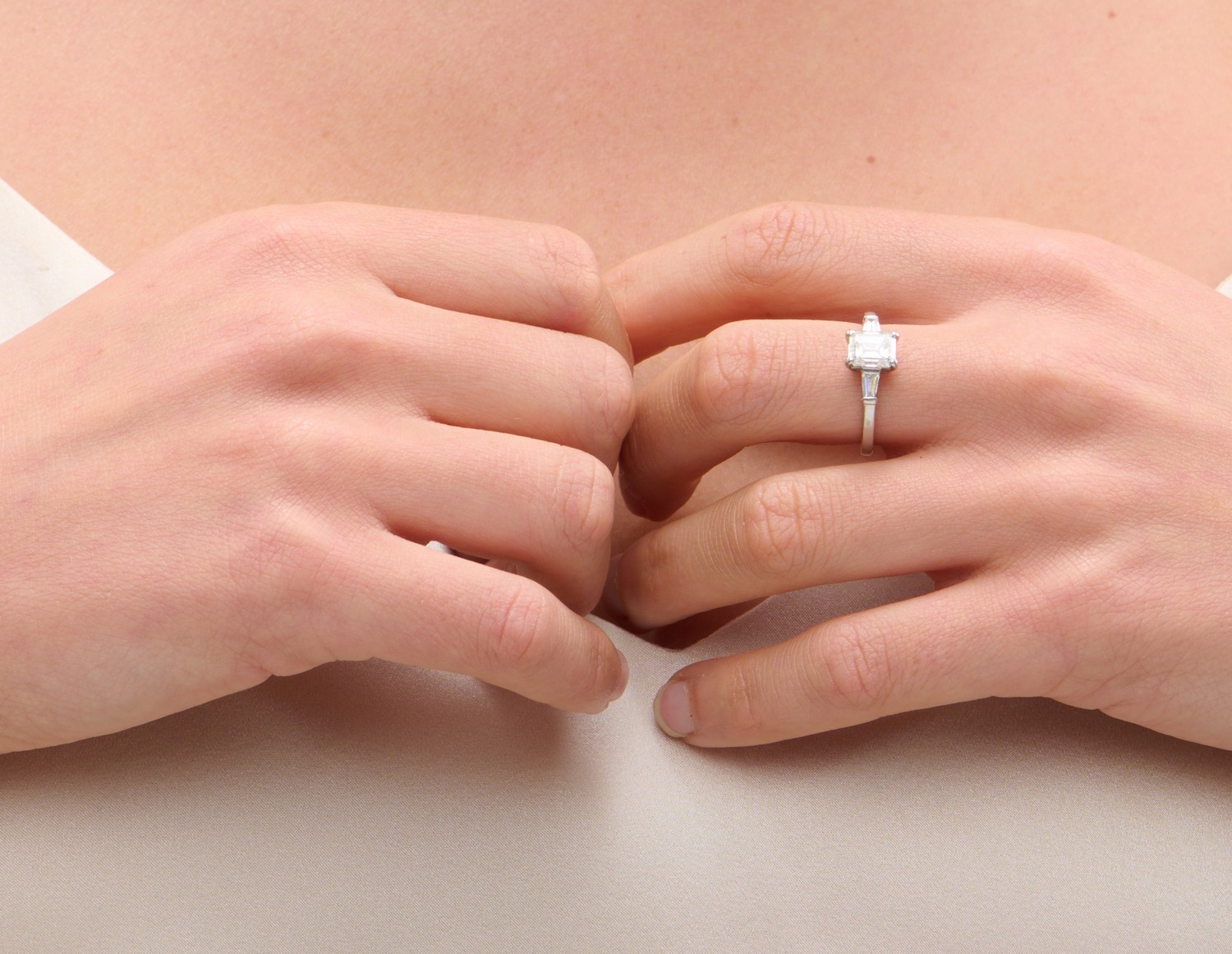 The emerald-cut diamond weighing 1.50 carats, is claw-set between a pair of tapered baguette diamond shoulders, mounted in 18ct white gold, size M, signed Bulgari, numbered 55247, Italian registration and maker's marks.