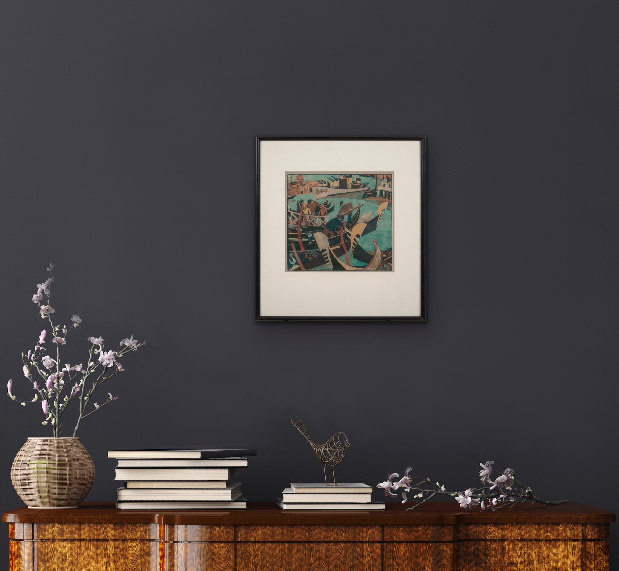 In a restrained palette of blue hues, chestnut and yellow, Tschudi intersects waves of bold form, presenting Schiffe 1951 - Venice on the move. Idyll gondoliers slice through the foreground revealing workers tending to their boats preparing for their next passengers. Waiting to board, a distracted flock of tourists, marvelling at the sheer scale of the ship approaching St Pauls Square.