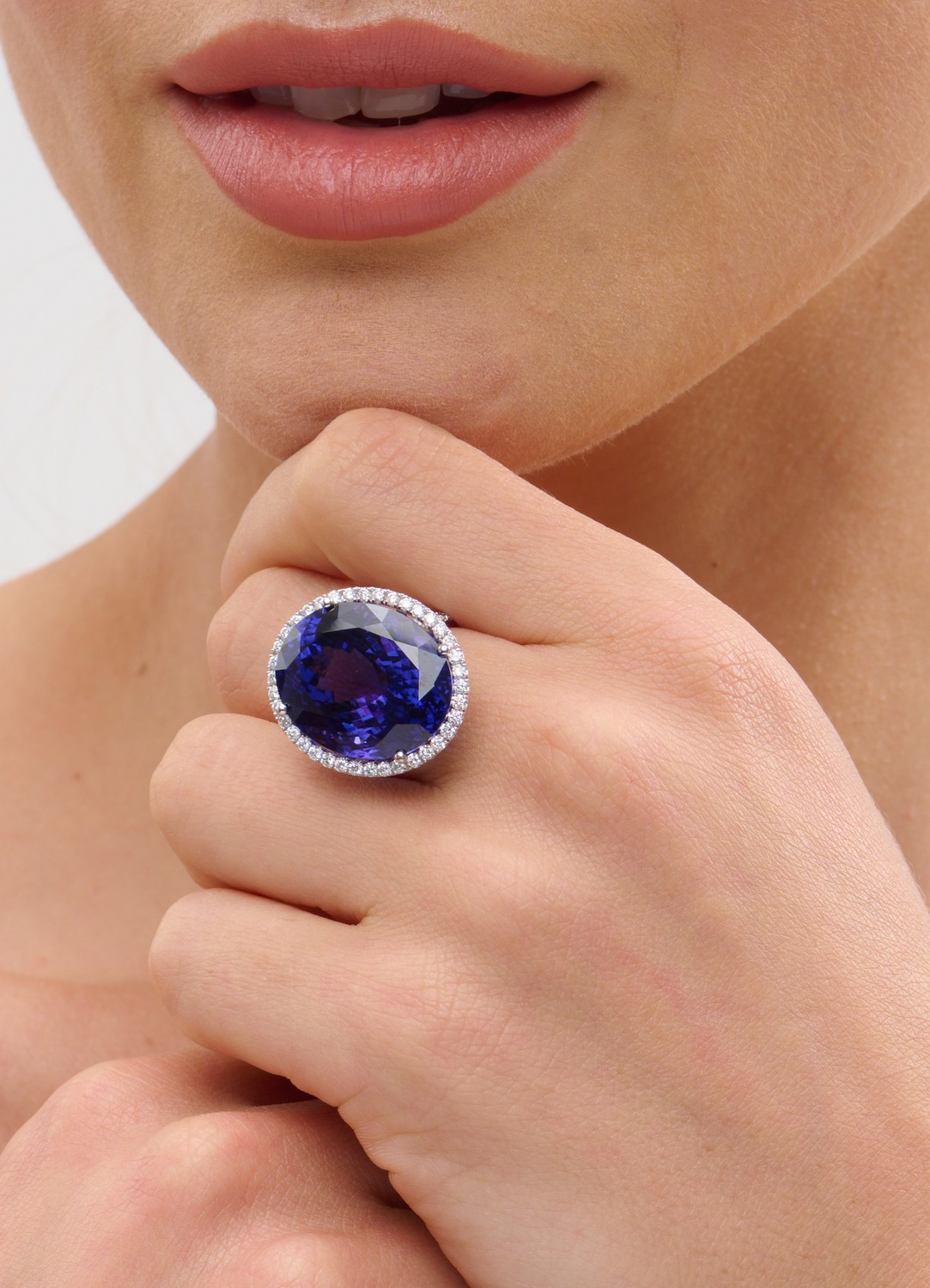 Of cluster design, centering a claw-set oval tanzanite weighing approximately 25.80 carats, with a halo of brilliant-cut diamonds to shoulders pavé-set with diamonds, the diamonds together weighing approximately 0.98 carat, mounted in platinum, size N.