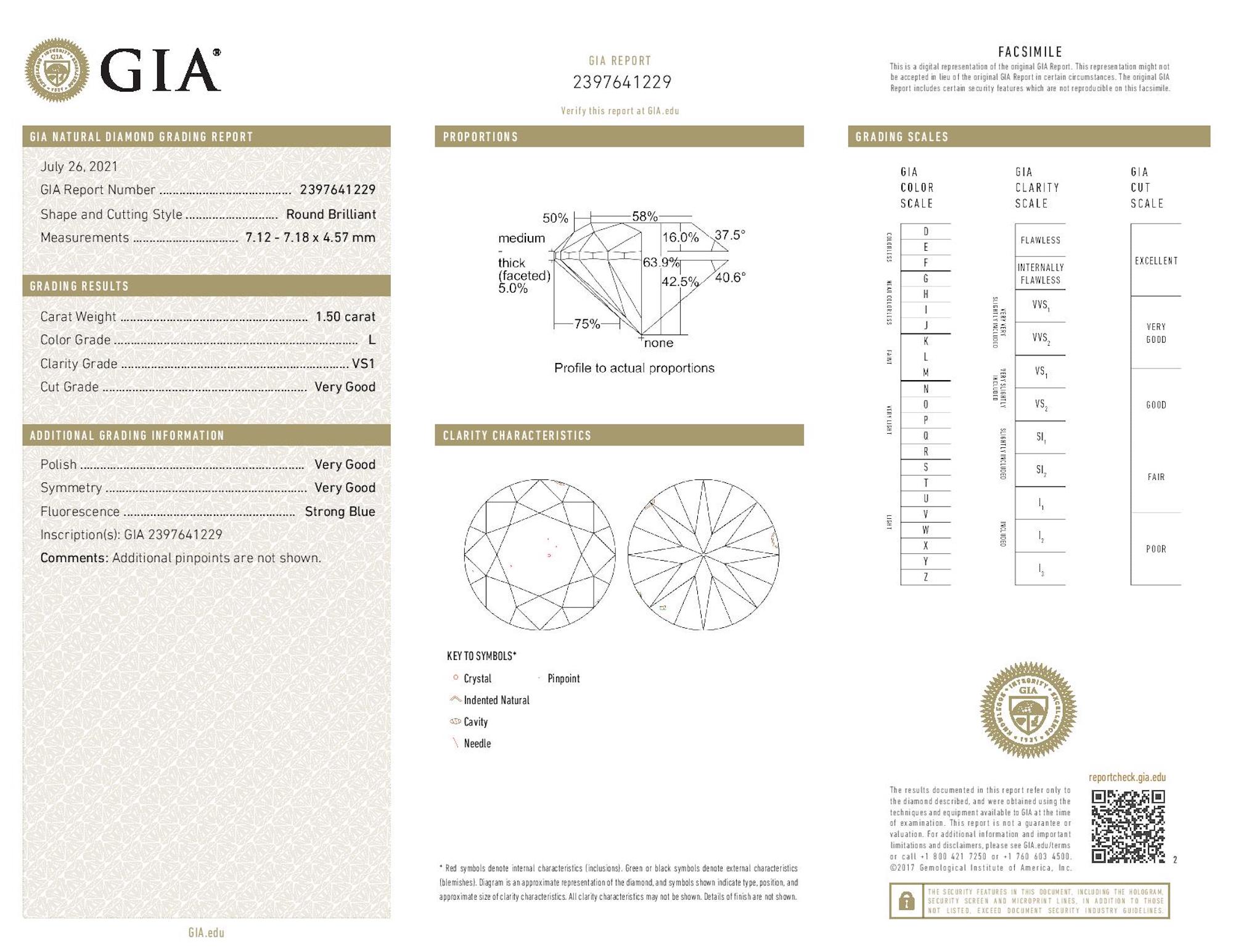 a GIA report numbered 2397641229, dated 26 July 2021, stating that the 1.50 carat diamond is natural, L colour, VS1 clarity, laser inscribed;