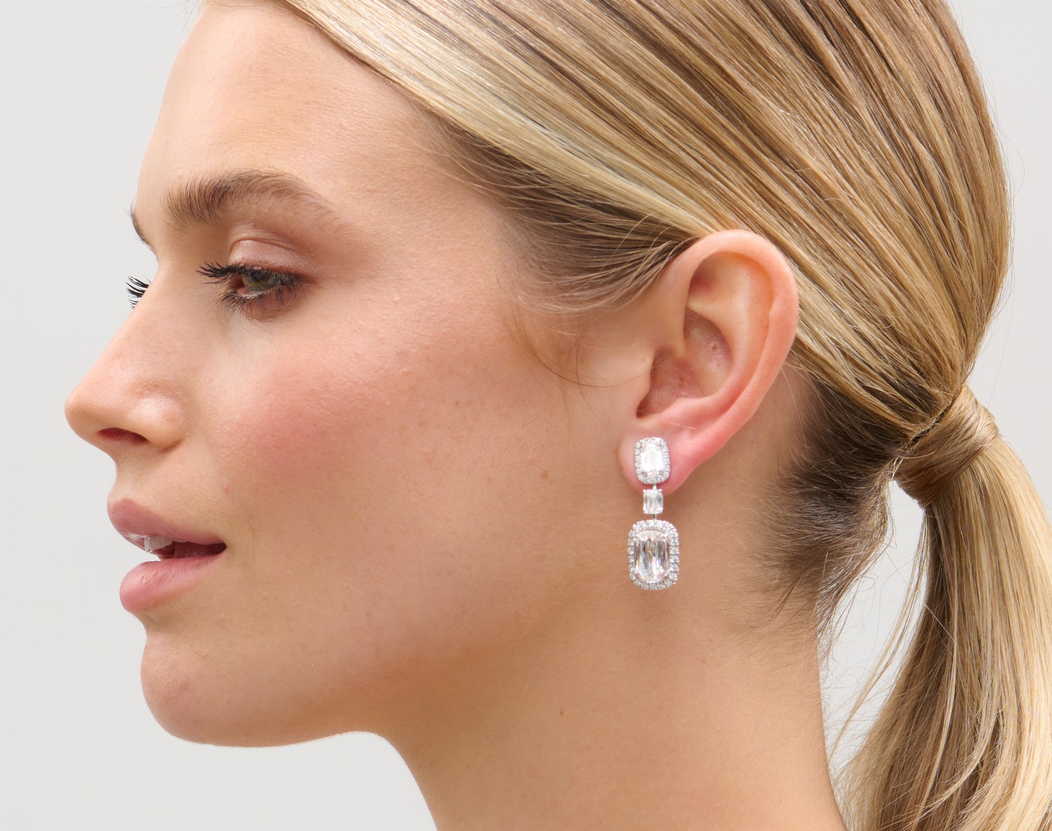 Each terminating in a cluster swing drop centering a claw-set modified rectangular brilliant-cut diamond weighing 5.01 carats and 5.09 carats respectively, framed by a halo of brilliant-cut diamonds, the reverse decorated in an openwork scroll pattern collet-set at intervals with Argyle fancy pink brilliant-cut diamonds, suspended from a similarly set cluster surmount centering a modified rectangular brilliant-cut diamond weighing 1.01 carats and 1.00 carats respectively, between a claw-set round-cornered rectangular modified brilliant-cut diamond connector weighing 0.57 carat and 0.58 carat respectively, the small near colourless diamonds and fancy pink diamonds together weighing approximately 1.21 carats and 0.08 carats respectively, mounted in platinum and 18ct white gold, length 35mm, post and clip fittings.