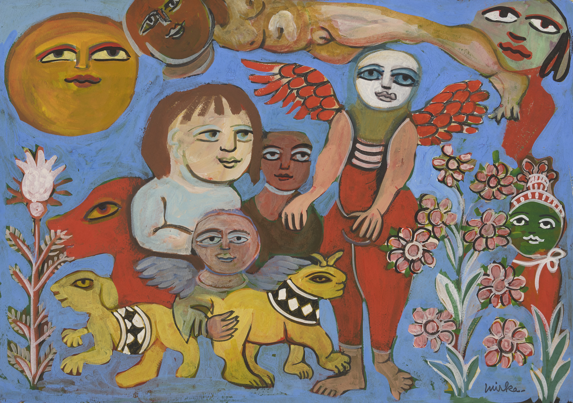 There is a light tear seen to the right hand edge, approximately 3.5cm in length. A small loss to the paper is seen in the lower left edge, approximately 5mm. There are hairline cracking present across the thicker pigments of paint, mainly prominent in the blue pigment. Well framed measuring 60 x 75cm.