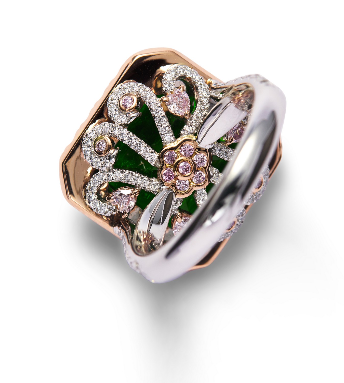 This rare and extraordinary ring from the 'Green Jewel Collection' references two exceptionally rare gemstones from mines at opposite ends of the earth: Muzo, Colombia and Argyle, Australia.