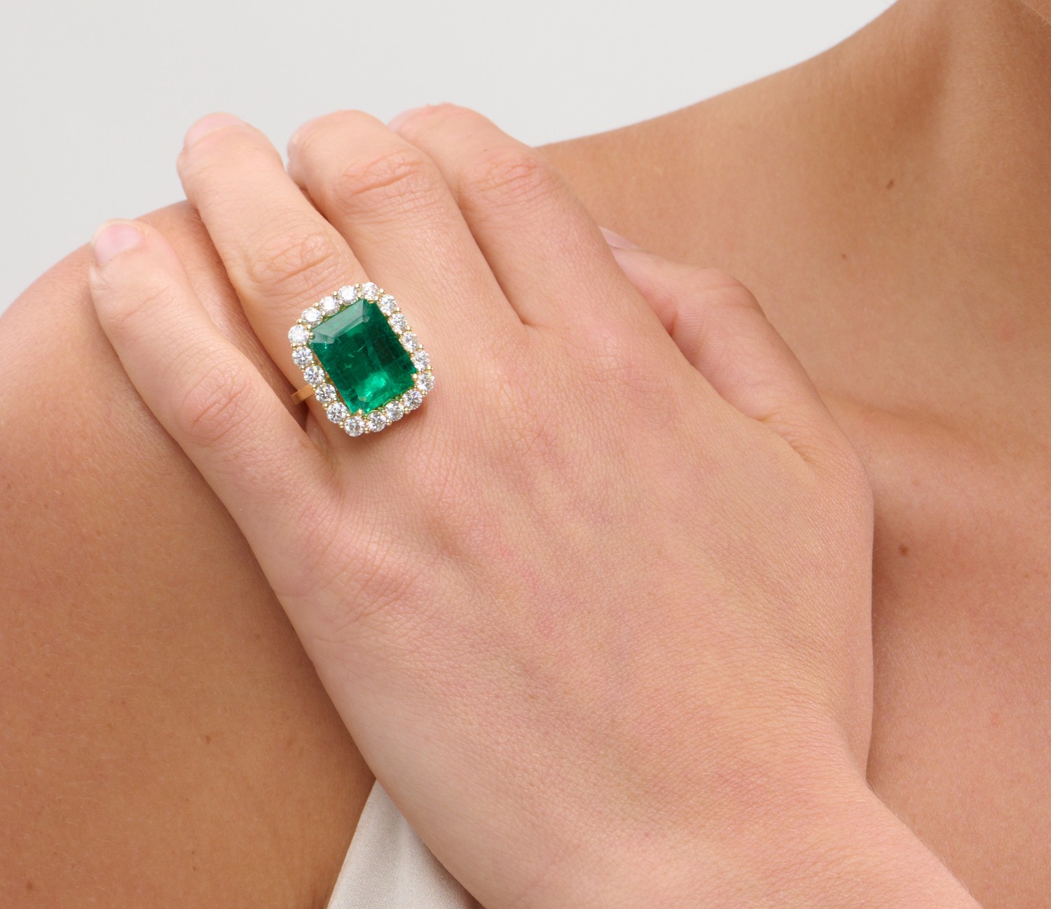 Of cluster design, centering a claw-set emerald-cut emerald stated to weigh 7.40 carats, framed by a line of brilliant-cut diamonds, the diamonds together weighing approximately 1.84 carats, mounted in 18ct gold, size K.