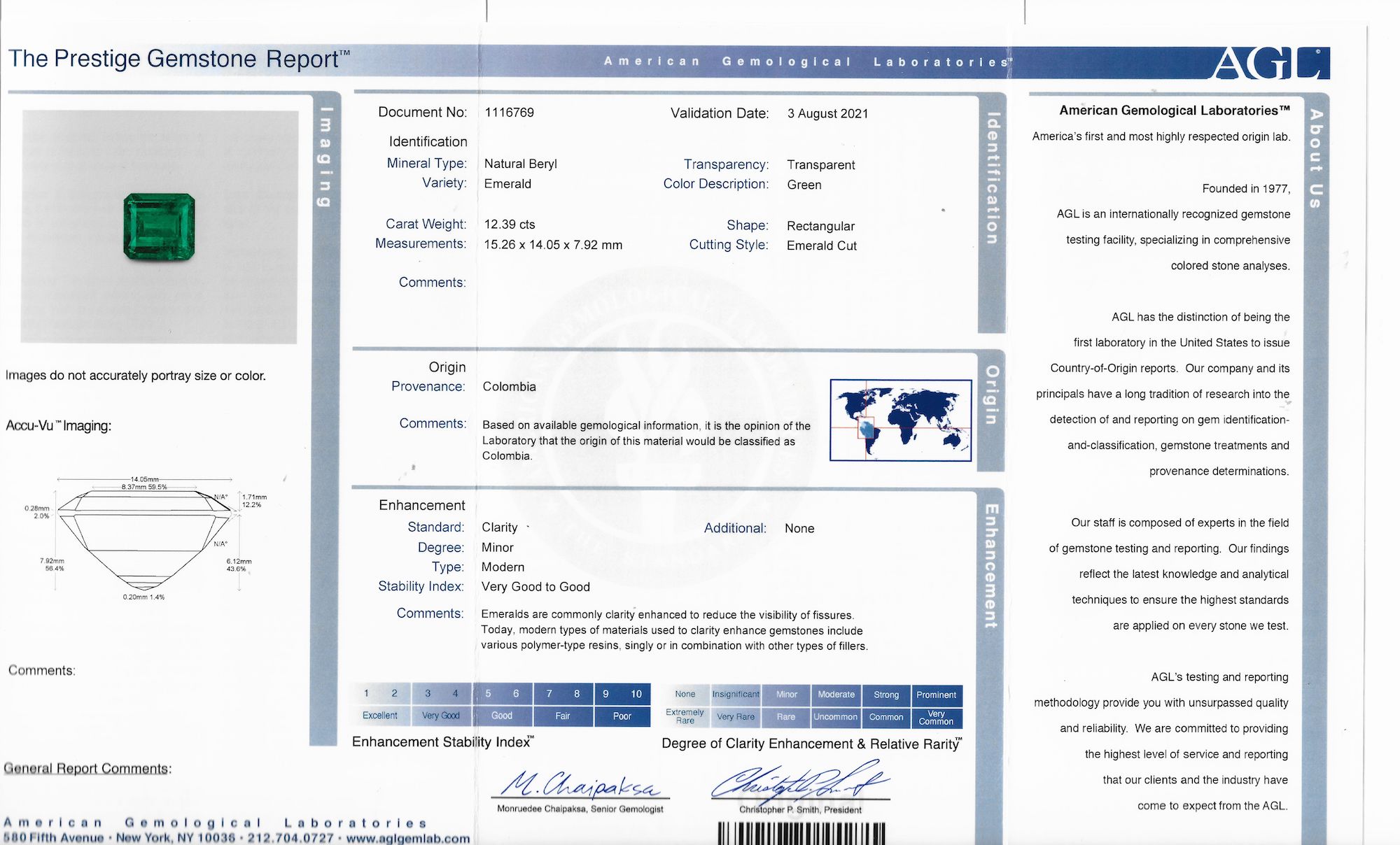 an AGL report numbered 1116769, dated 3 August 2021, stating that the 12.39 carat emerald is natural, minor clarity enhancement, of Colombia origin.