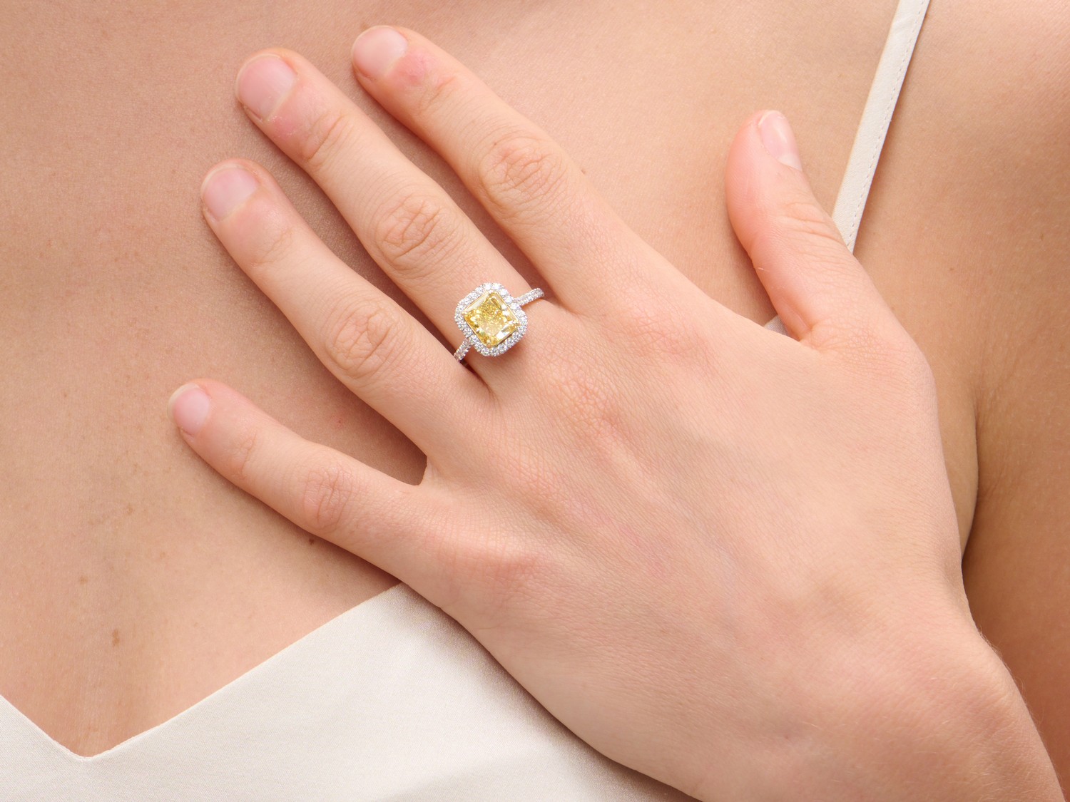 FANCY VIVID YELLOW DIAMOND AND DIAMOND RING