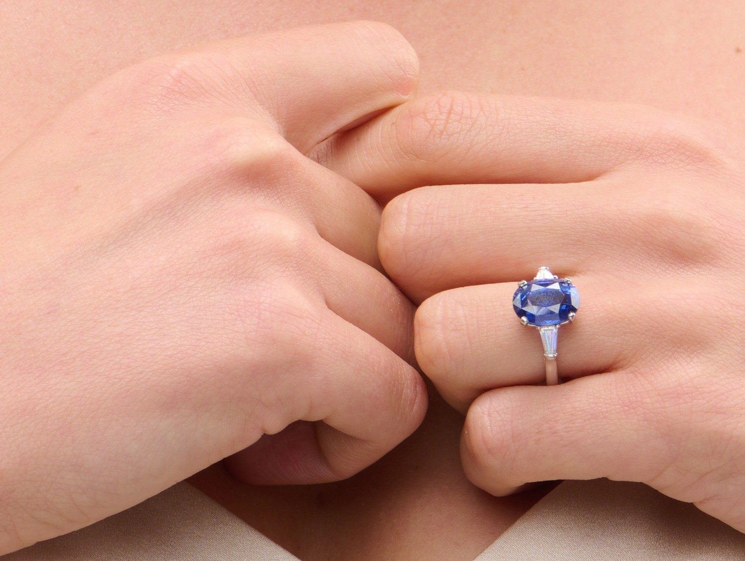 The oval modified brilliant-cut sapphire weighing 5.54 carats is claw-set between a pair of tapered baguette diamonds together weighing approximately 0.40 carat, mounted in platinum, size J, numbered BL1915A, signed Van Cleef & Arpels.