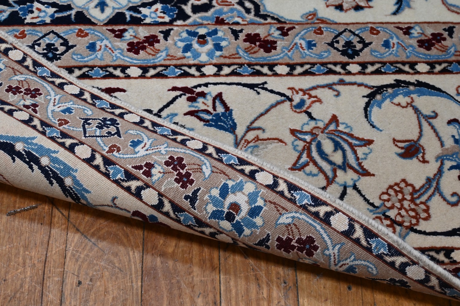 MOST ATTRACTIVE PERSIAN SILK & WOOL NAIEN CARPET EX-GALLERY PIECE. EXTREMELY FINELY HAND-KNOTTED WITH APPROXIMATELY 600,000 INDIVIDUAL KNOTS PER SQUARE METER. COMPRISING OF A 32 POINT INTRICATE LOBED MEDALLION SURROUNDED BY SPRAYS OF ROSES MOTIFS WITH IN AN OUTER LARGE OVAL MEDALLION. ALL MAJOR MOTIFS HIGHLIGHTED WITH PERSIAN CASPIAN SILK WITH A 100% KORK WOOL PILE IN TONES OF INDIGO AND FRENCH BLUE WITH AN IVORY GROUND COLOUR. CARPETS FROM NAIEN ARE RENOWNED FOR THEIR FINE CRAFTSMANSHIP AND POPULARITY ALSO ARE VERY HIGHLY RATED AMONGST THE TOP 5 MAJOR WEAVING REGIONS OF IRAN. SIZE: 356 x 253CM- ORIGIN: IRAN - RRP: $14,000 DOCUMENTATION OF AUTHENTICITY INCLUDED