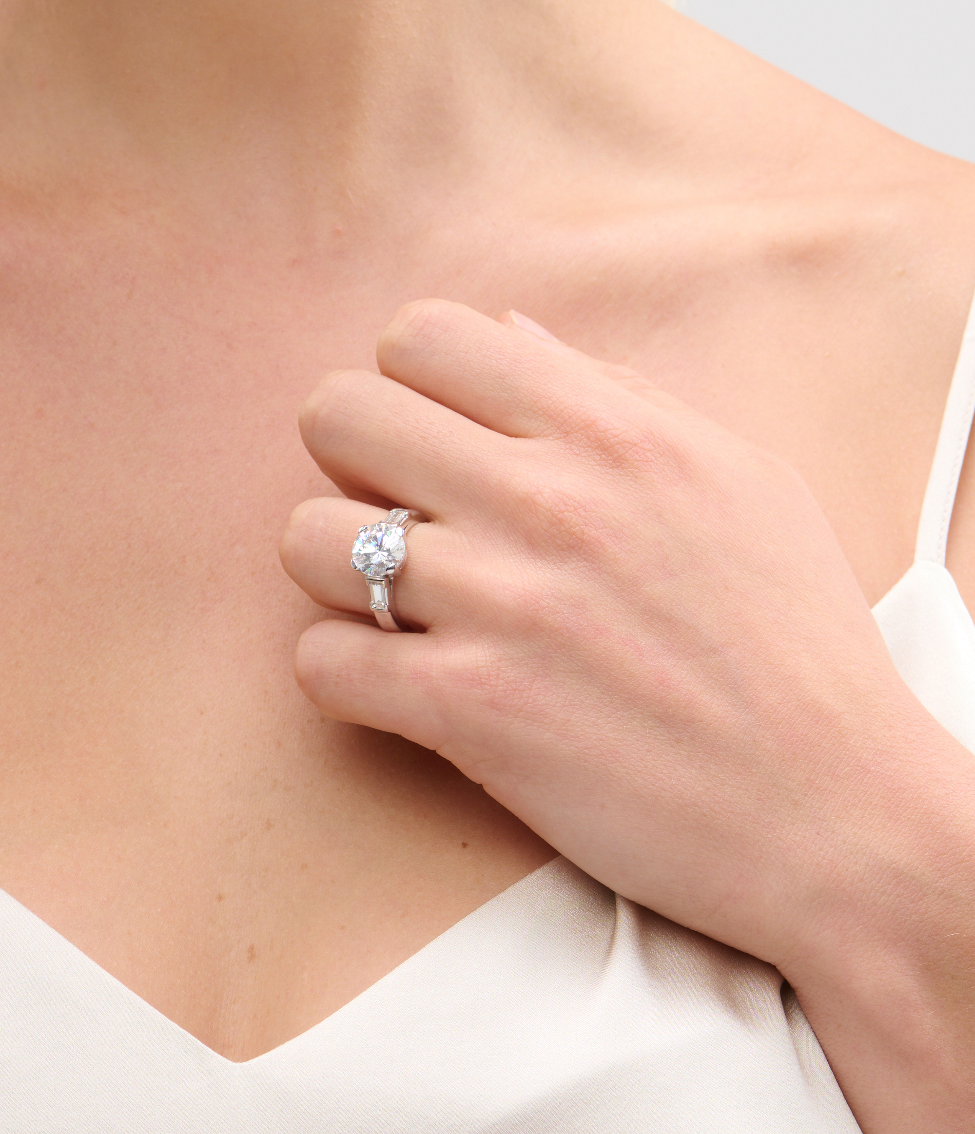 The brilliant-cut diamond weighing approximately 3.01 carats, is claw-set between a pair of baguette diamonds weighing approximately 0.40 carats, mounted in 18ct white gold, size N.