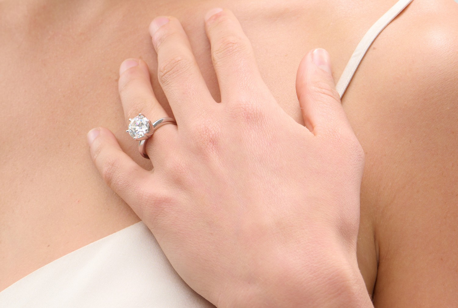 Claw-set with a round brilliant-cut diamond weighing 3.40 carats, mounted in platinum, size J1/2, signed Solstice, Seattle, Washington.
