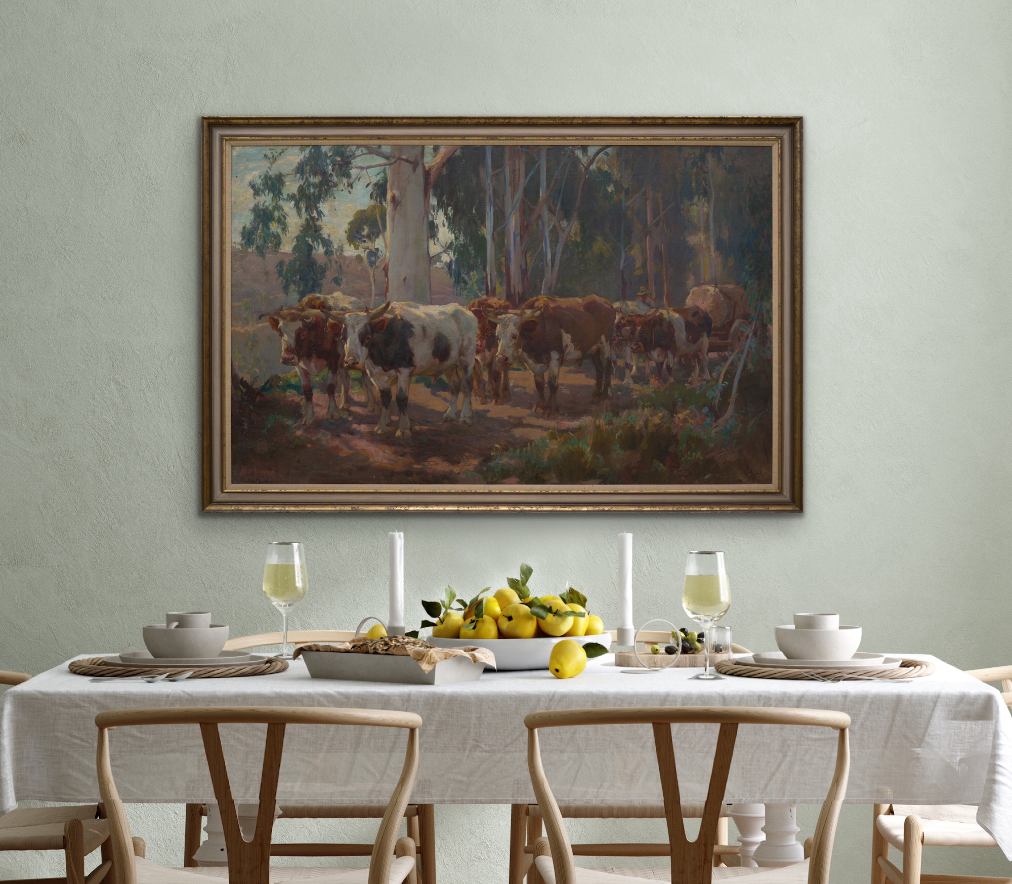 World War I was looming and Power felt compelled to join. His application, however, was met with rejection as his hearing impediment was too much of a handicap. Throwing himself back into his painting, he focused on another reworking of a bullock team, but this time on a more impressive scale. Standing at a monumental 122 x 183cm, The Bullock Team c.1914 is a statement piece that could not be overlooked. Proudly shown at several esteemed exhibitions, this piece commanded pride of place and was 'hung on the line' at the 1915 Exhibition of the Royal Academy of the Arts in London. Only an esteemed artist could claim such a valuable position on the wall at eye level, guaranteeing maximum exposure. The painting was so widely praised during the exhibition that it was selected for inclusion at the internationally acclaimed Royal Scottish Academy of Painting in 1916.