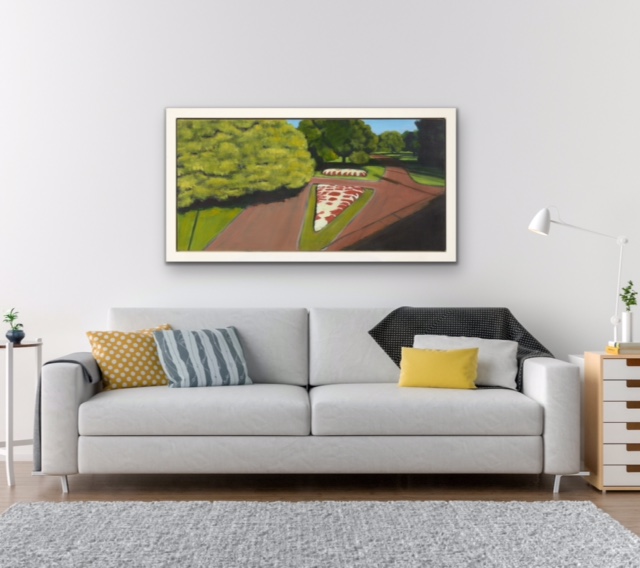 The top left corner of the work has marks of white paint, possibly inherent, as well on the bottom centre edge. There is wear and tear around corners of canvas, possibly before framing. There are some marks seen to the edges of frame. Overall size measuring 73 x 132cm.