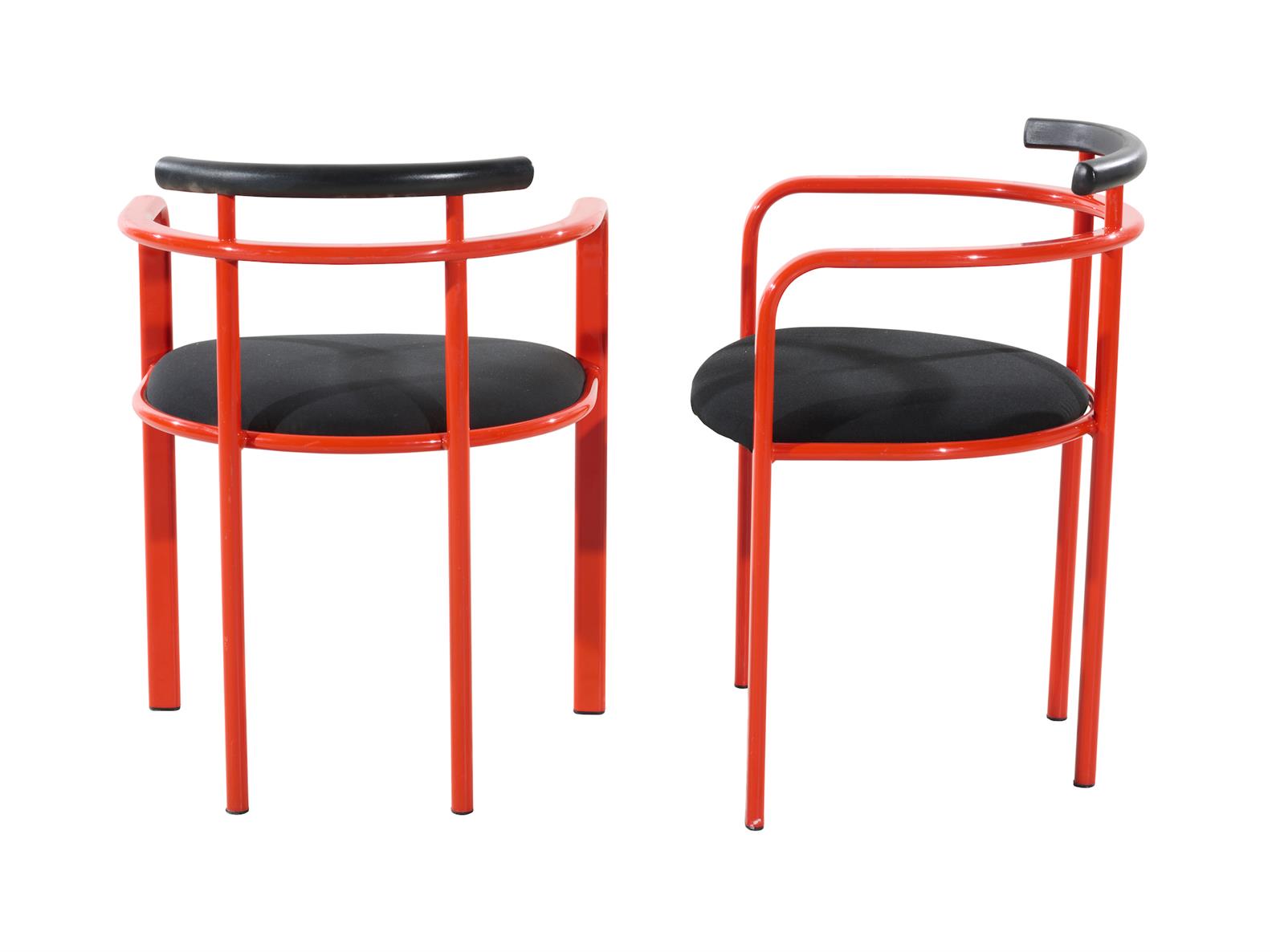 Orange powder coated metal with rubber back feature and original black cotton upholstered seats.