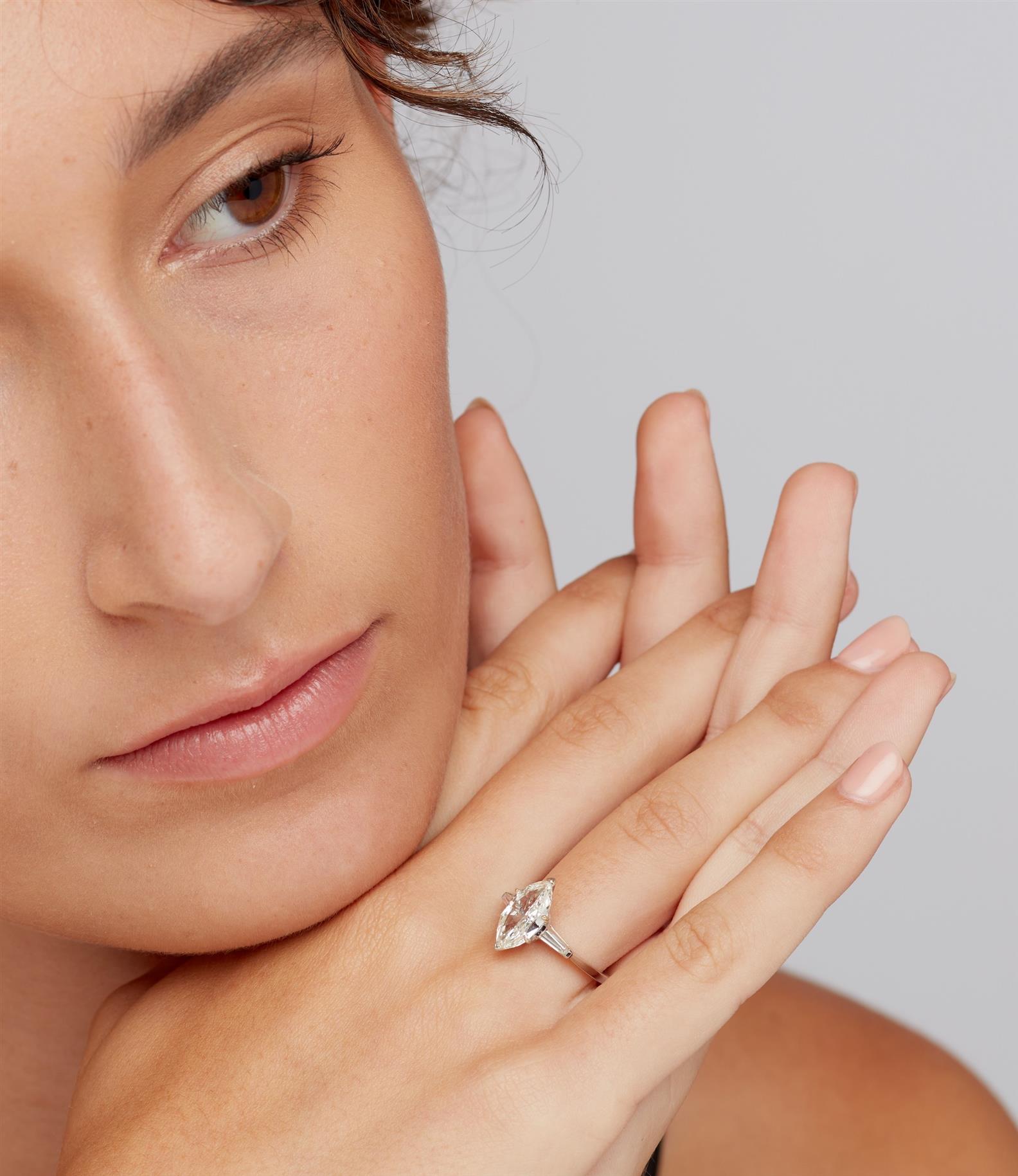 The marquise-shaped brilliant-cut diamond weighing 1.75 carats, is claw-set between a pair of tapered baguette-cut diamond shoulders, mounted in platinum, size N.