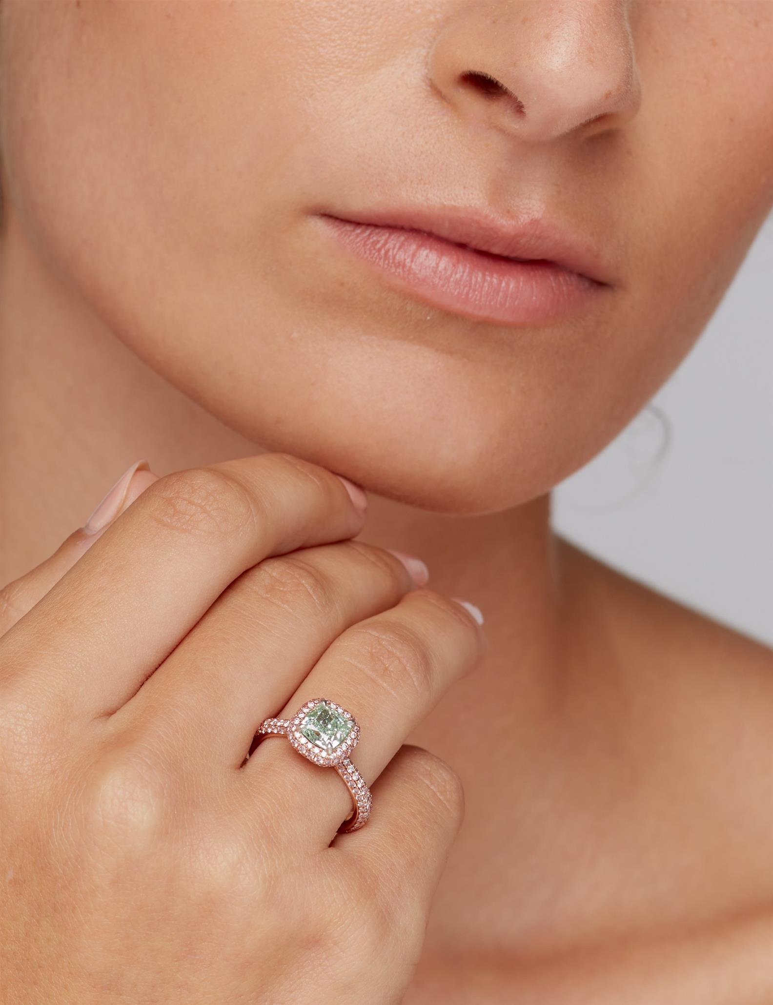 Of cluster design, centring a claw-set cushion-shaped modified brilliant-cut natural fancy intense bluish green diamond weighing 1.71 carats, framed by a halo of Argyle natural fancy pink brilliant-cut diamonds, the shoulders, gallery and under rail pavé-set with Argyle pink diamonds mounted in 18ct pink gold, the Argyle pink diamonds together weighing 1.17 carats, size M.