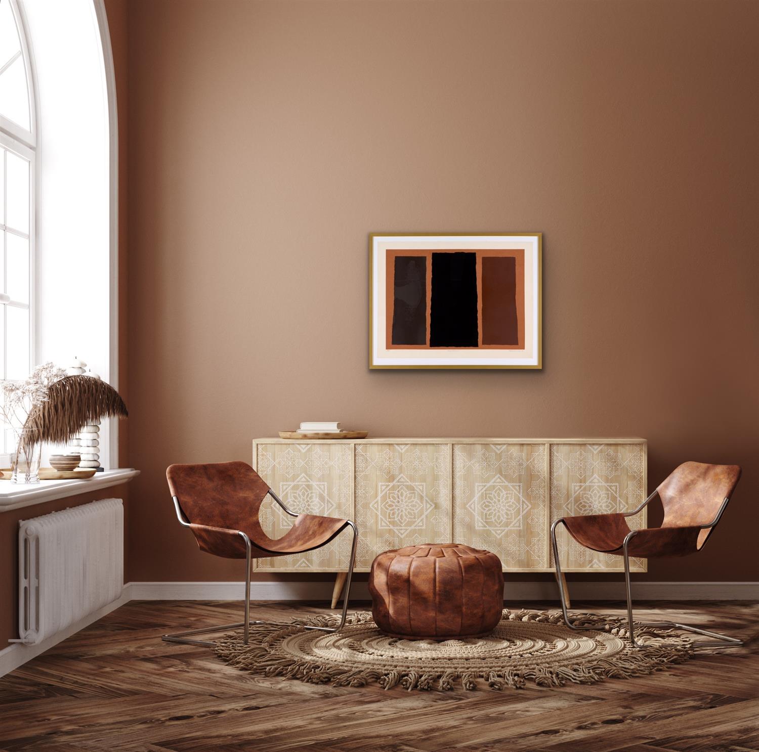 Work is in good condition overall. A inconsistency within the black pigment (within the far left panel) is present, resulting in a patch-like area of lighter black. Well framed measuring 70.5 x 90cm.