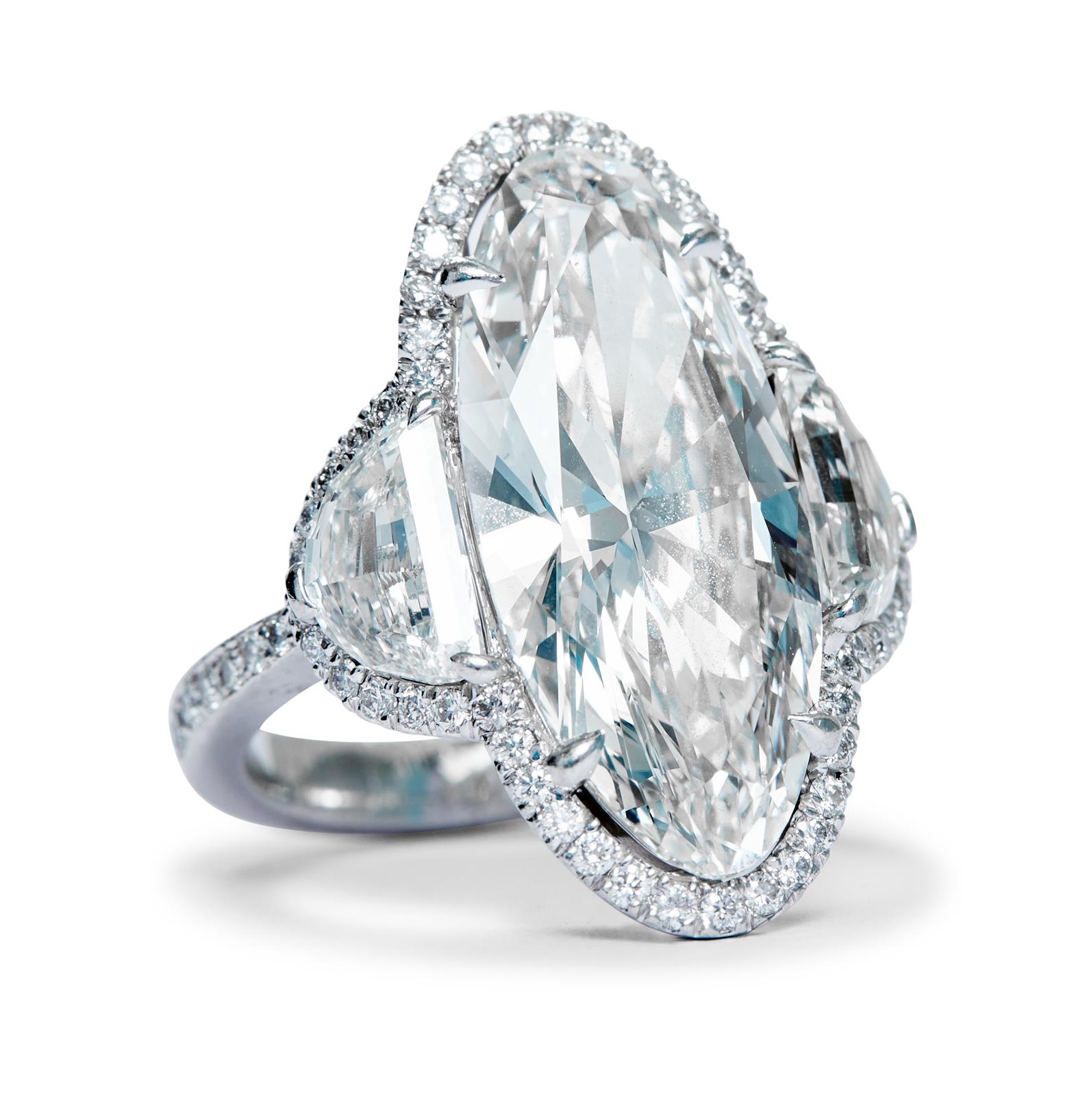 The modified marquise-shaped brilliant-cut diamond weighing 6.33 carats, is claw-set between a pair of half-moon diamonds together weighing approximately 1.55 carats, the edge, shoulders and gallery pavé-set with brilliant-cut diamonds, the small diamonds together weighing approximately 0.55 carat, mounted in platinum, size J1/2.
