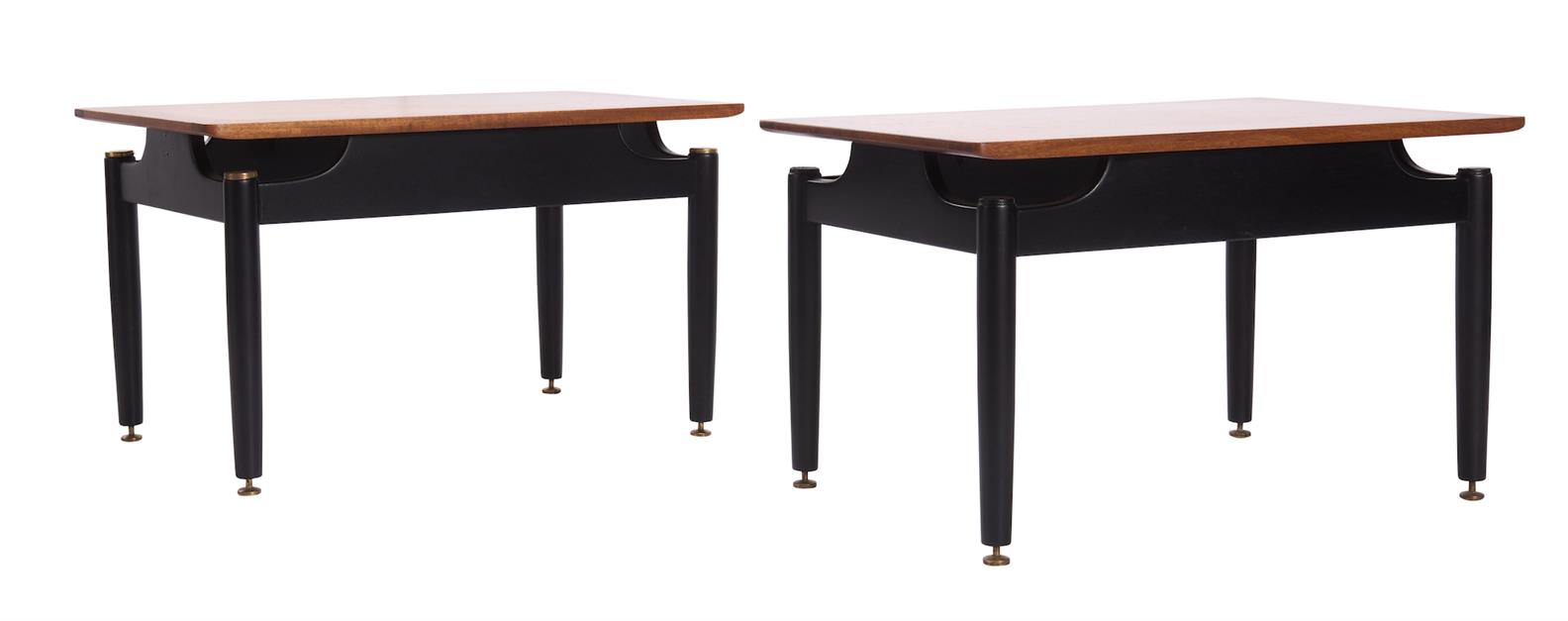 One of the tables is missing brass caps to the top of legs. Losses to the patina of the brass feet. Otherwise both tables have been properly restored with only minor surface scratches and heat damage consistent with their age and use. Structurally sound. Overall in good condition.