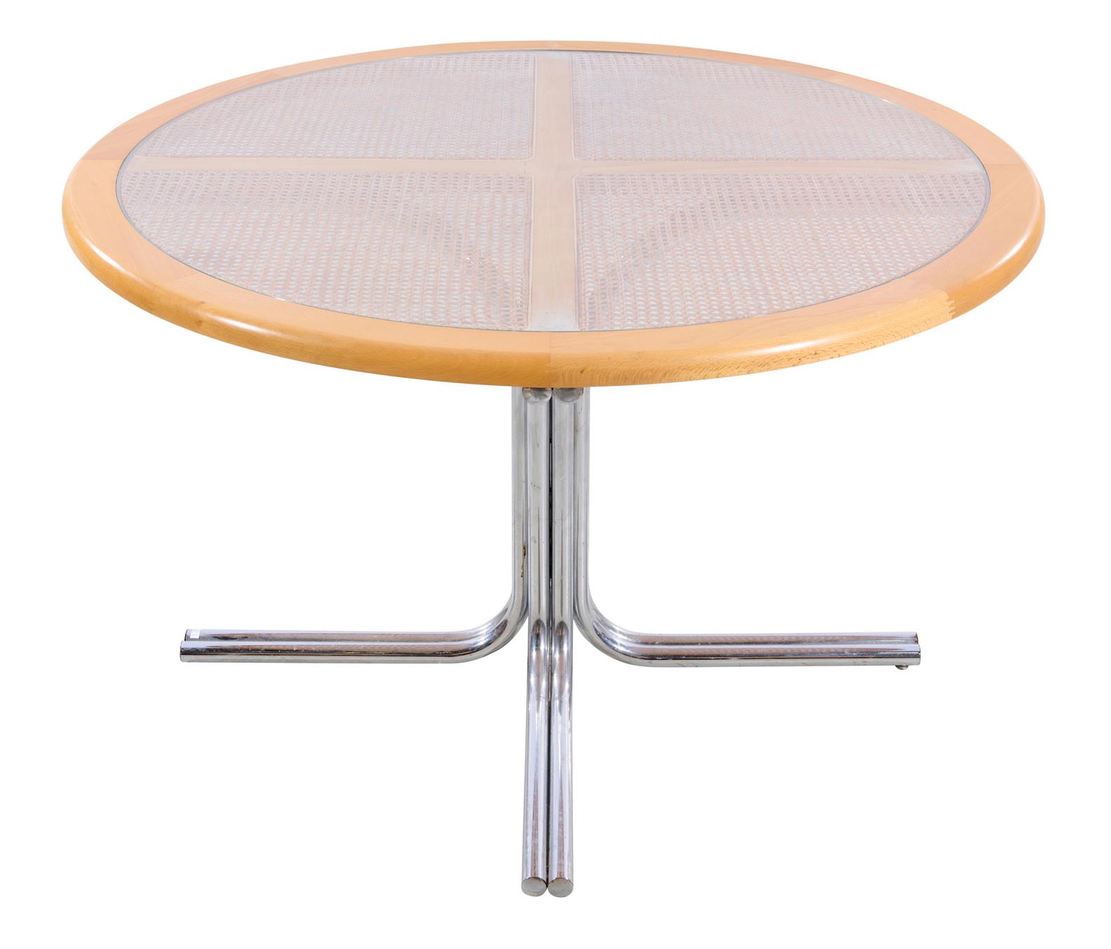 Chrome, glass, cane, metal, and beech. Four chairs and a round dining table.