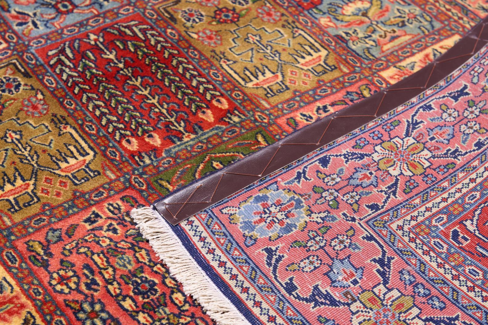A STUNNING FINE PERSIAN GARDEN DESIGN SAROUQ CARPET. 100% WOOL DENSE PLUSH PILE. FINELY HAND KNOTTED CITY WEAVE WITH A DESIGN OF INDIVIDUAL PANELS CONTAINING GARDEN THEMES OF WILLOW TREES, FLOWERS & MOTIFS. BORDER OF ROSETTES AND FLORAL SPRAYS. EX-GALLERY EXHIBITED CARPET. IN PRISTINE CONDITION. SIZE: 225 X 130 CM. ORIGIN: PERSIA - RRP: $2,900. DOCUMENTATION OF AUTHENTICITY INCLUDED.
