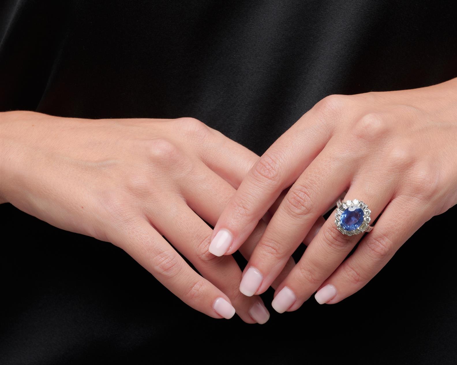 A SAPPHIRE AND DIAMOND SET RING IN PLATINUM, CENTRING AN OVAL-CUT SAPPHIRE WEIGHING 7.16 CARATS, WITHIN A SURROUND OF BAGUETTE AND BRILLIANT-CUT DIAMONDS TOGETHER WEIGHING APPROXIMATELY 2.80 CARATS, SIZE M, ACCOMAPNIED BY GSL CERTIFICATE NUMBERED AA66387 DATED 17TH JUNE 2022 STATING ORIGIN CEYLON, NO EVIDENCE OF HEAT TREATMENT