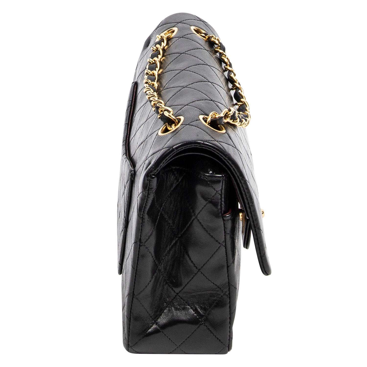 Styled in black quilted lambskin leather with interlaced chain shoulder strap and gold tone metal hardware, 26 x 16 x 7cm.