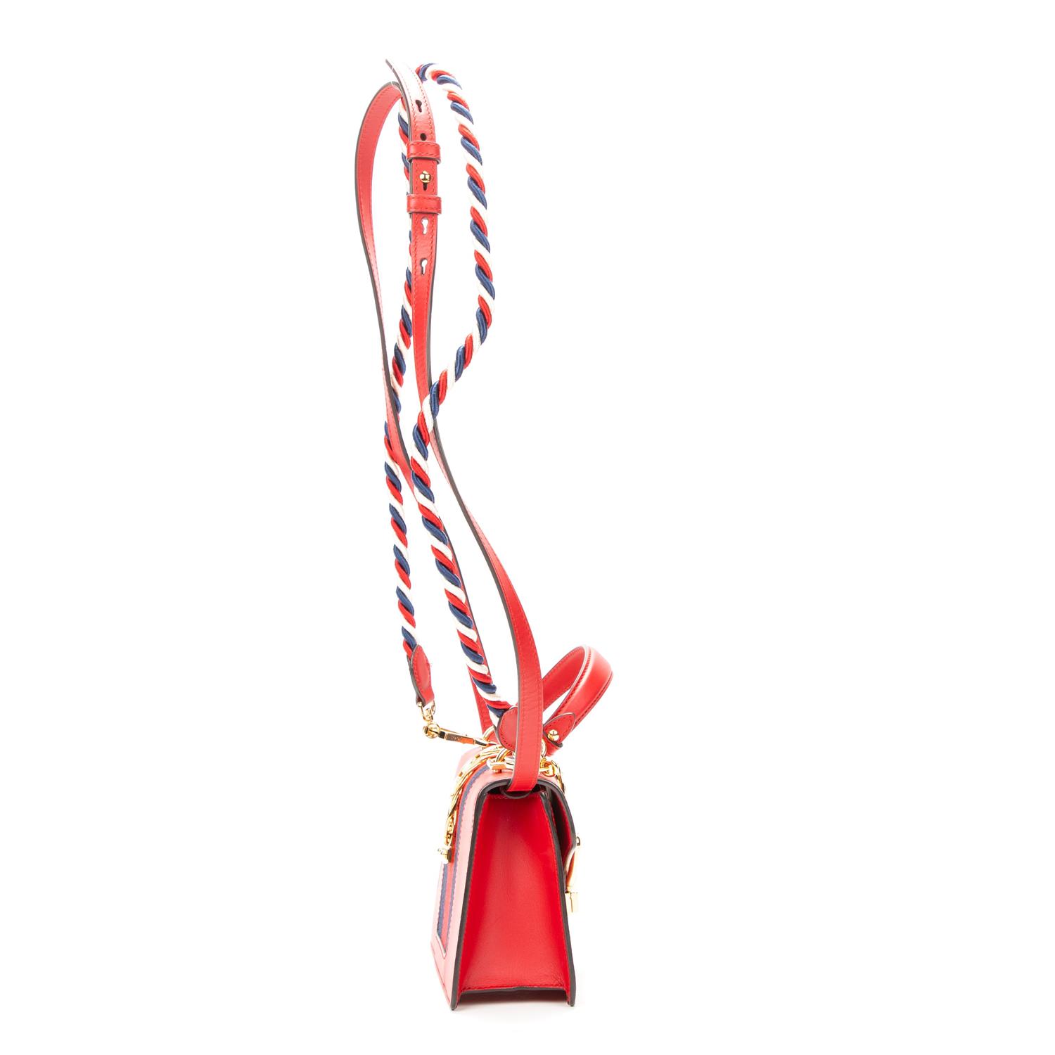 Styled in red calfskin leather with conforming top handle and detachable shoulder strap and gold tone metal hardware, 20 x 14 x 8cm.