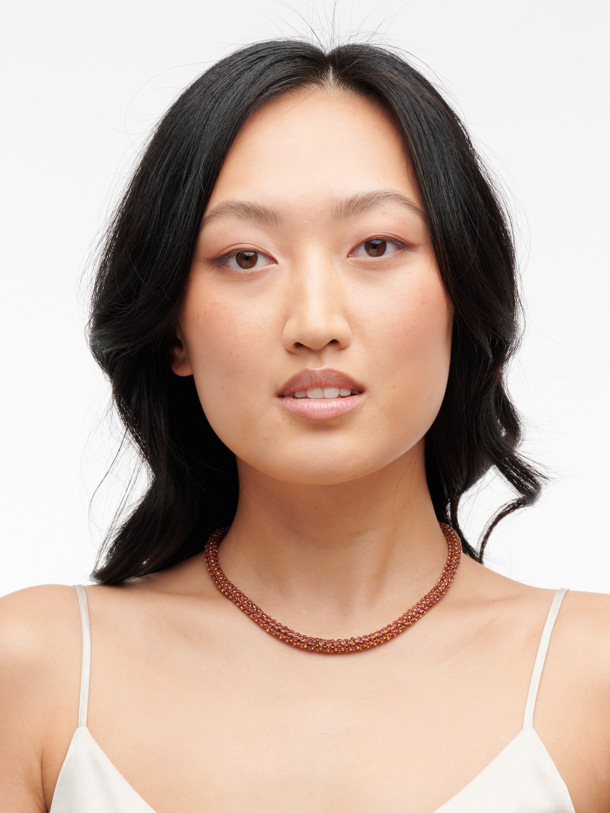 The rounded articulated chain, set with rows of bezel-set circular synthetic rubies cut en cabochon, completed by a s-link clasp, length 460mm.