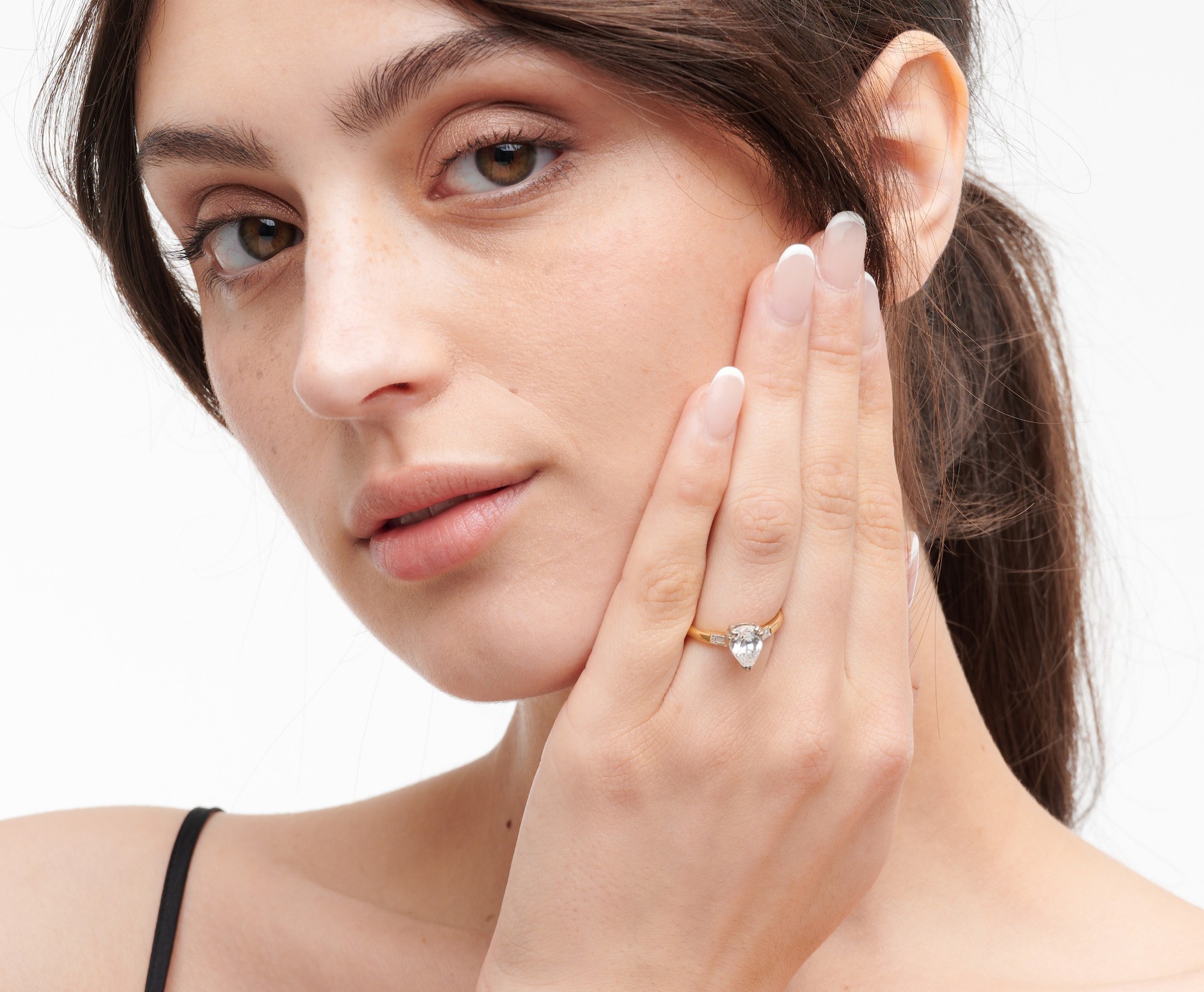 Claw-set with a pear-cut diamond weighing approximately 1.25 carats, to baguette-cut diamond set shoulders together weighing approximately 0.20 carats, size K.