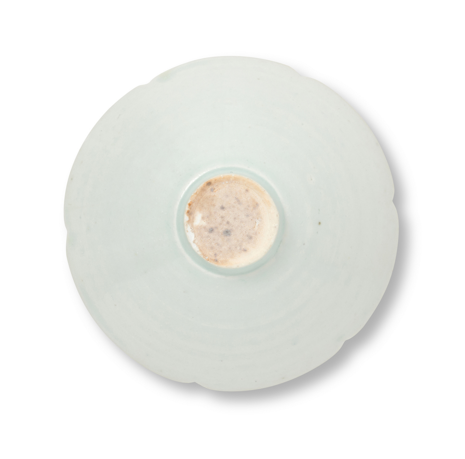 With gently rounded sides and a lobed, foliate rim, decorated to the interior with combed decoration of clouds, and covered in a clear pale blue glaze.
