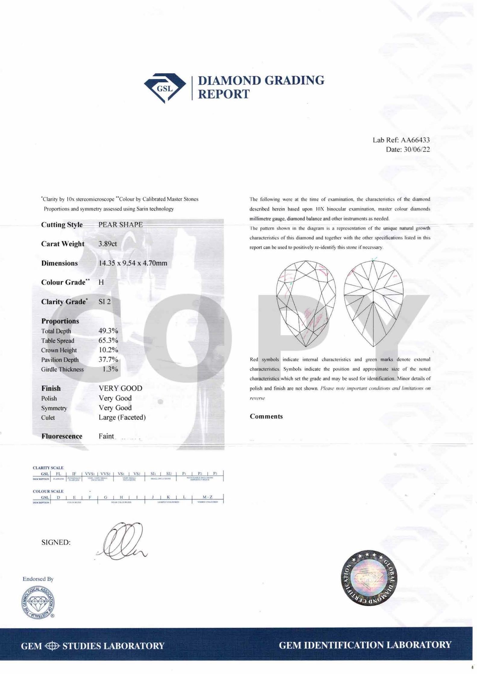 Accompanied by a GSL report numbered AA66433, dated 30 June 2022, stating that the 3.89 carat diamond is natural, H colour, SI2 clarity.