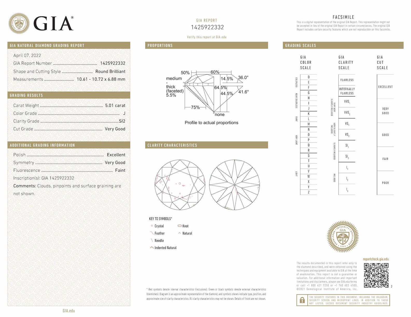 a GIA report numbered 1425922332, dated 7 April 2022, stating that the 5.01 carat diamond is natural, J colour, SI2 clarity, laser inscribed;