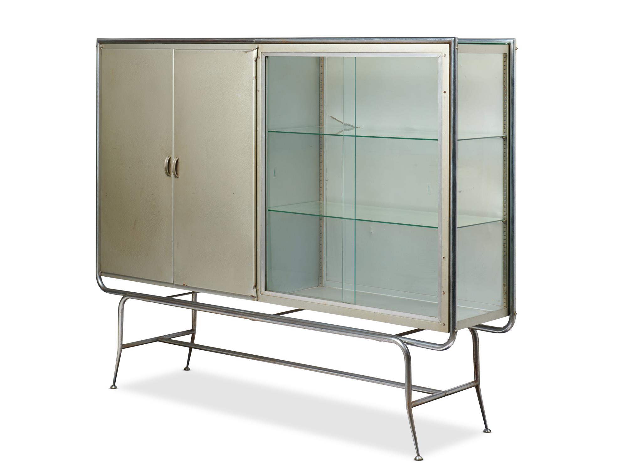 Nickel plated and painted metal with glazed sliding doors.