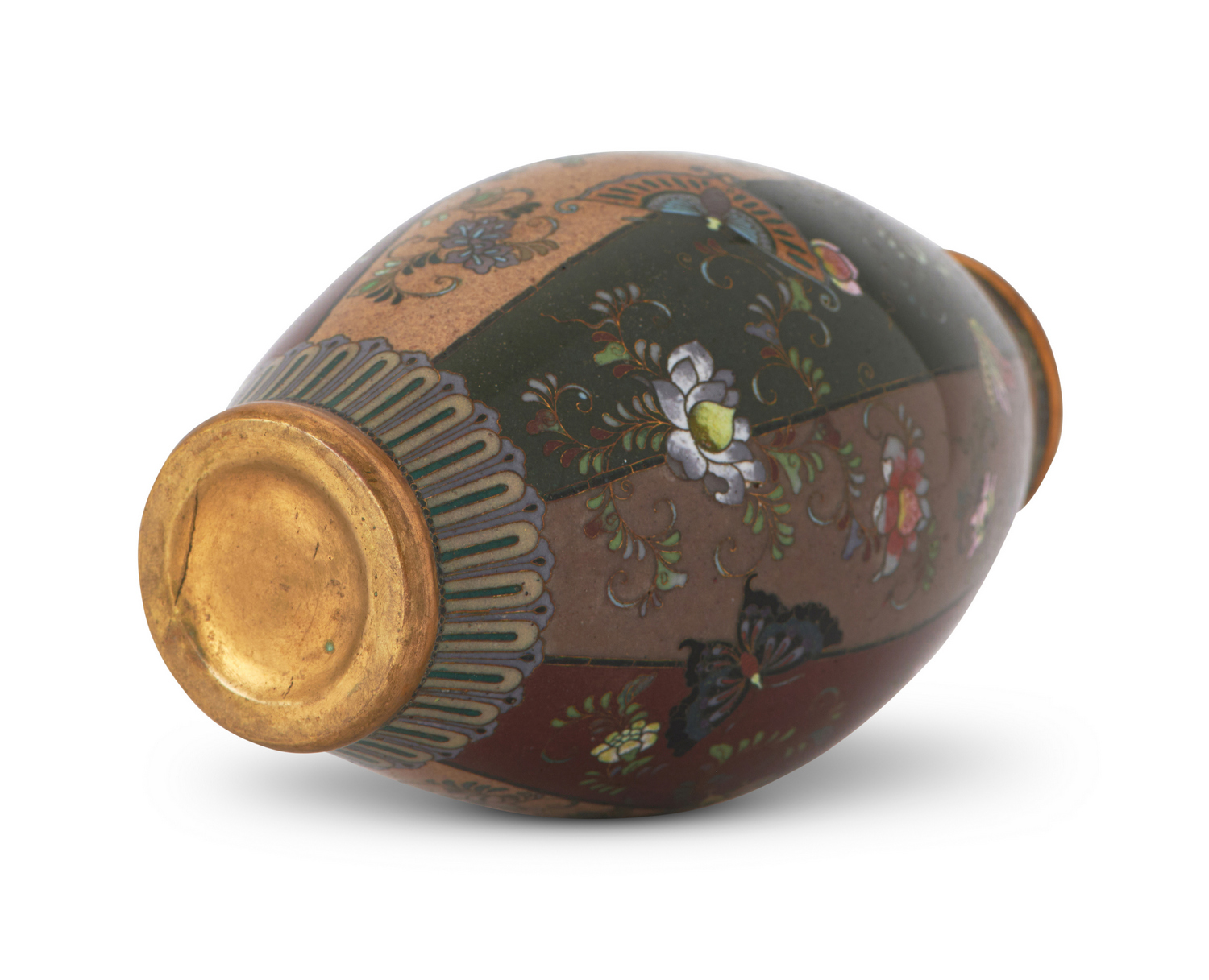 With high quality enamel decoration in six alternately coloured sections with scrolling grasses, flowers and various butterflies in flight. The neck and shoulder featuring repeated floral designs and lappets. Unsigned.