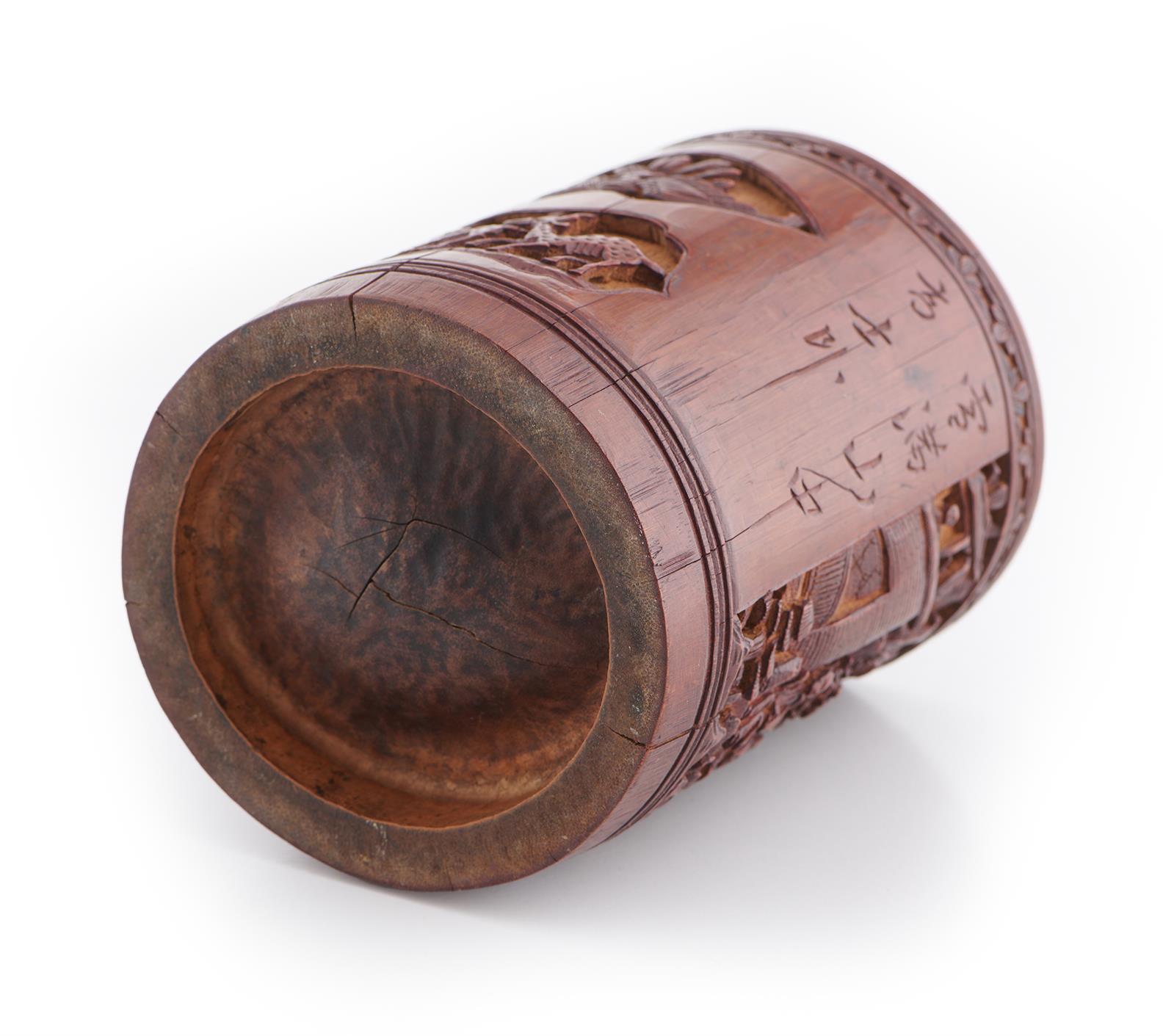 Decorated to one side with deeply carved relief-work depicting six scholars in a garden setting, and to the reverse with two shaped reserves containing a peacock and a pair of deer, flanked by calligraphy couplets.