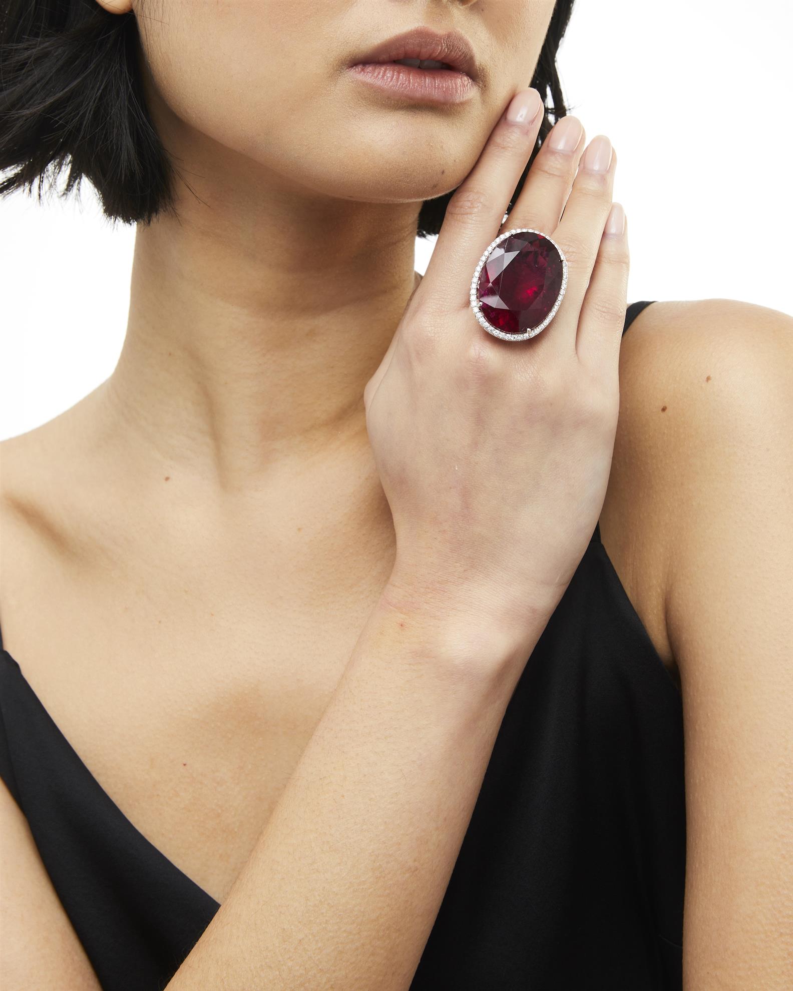 Of cluster design, centring a claw-set oval red tourmaline weighing 67.31 carats, framed by a halo of brilliant-cut diamonds, to similarly set shoulders, the small diamonds together weighing approximately 1.54 carats, mounted in 18ct white gold, size M.