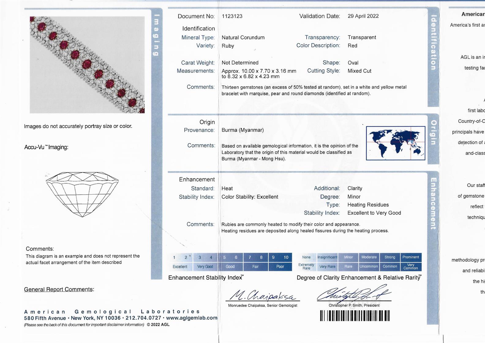 Accompanied by an AGL report numbered 1123123, dated 29 April 2022, stating that the red rubies are natural, heated, of Burma (Myanmar) origin.