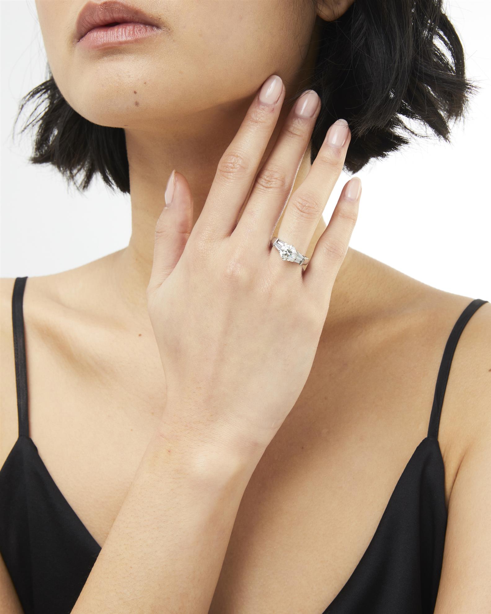 The round brilliant-cut diamond weighing 1.51 carats is claw-set between a pair of tapered baguette-cut diamonds together weighing approximately 0.60 carats, mounted in platinum, size J1/2.